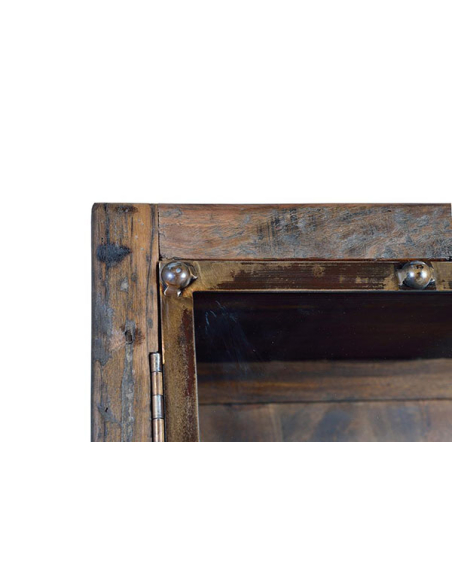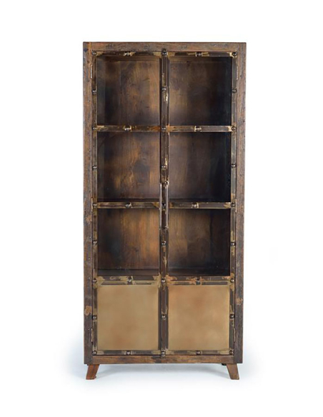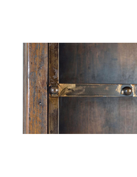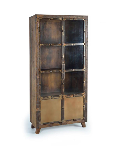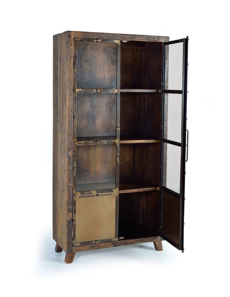 Vitrina madera recuperada traviesa de ferrocarril, sostenibilidad y estilo de la mano de esta vitrina de madera recuperada de traviesas de ferrocarril. Cada pieza es única, con su propia pátina y carácter que cuentan una historia de tiempos pasados. Perfecta para exhibir tus objetos más preciados, esta vitrina añade un toque de encanto rústico a cualquier espacio. Esta vitrina con estructura de madera tiene cuatro estantes, tres a la vista y uno oculto. Recubierta con dos puertas metálicas esta vitrina es una pieza rustica ideal para decorar con originalidad cualquier ambiente.
