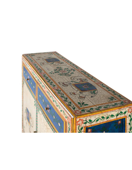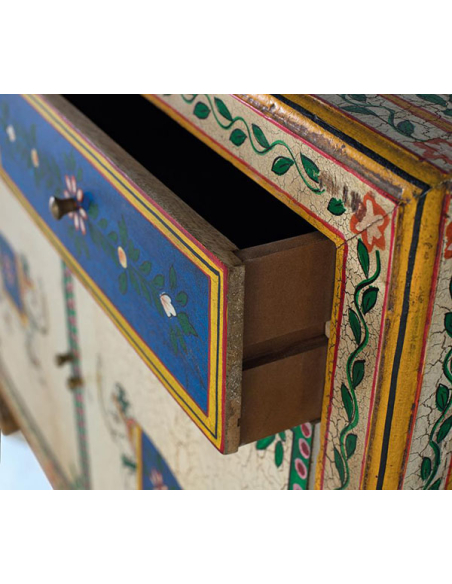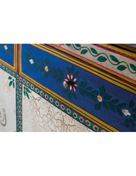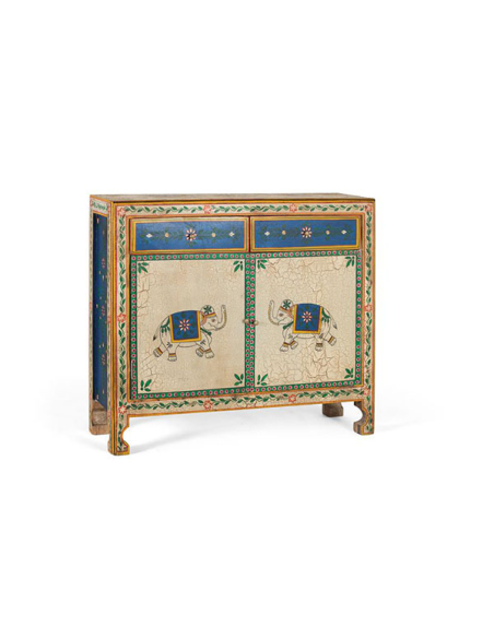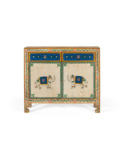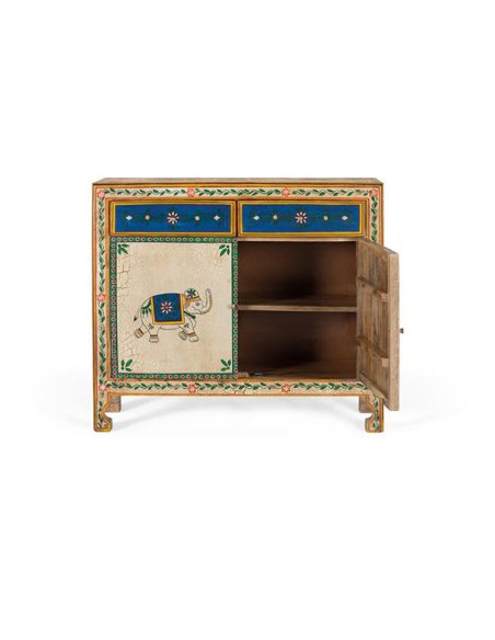 Aparador Clutha 2 puertas pintado a mano, inspirado en la rica cultura de la India, es una obra de arte que transformará tu espacio. Con dos puertas con estantes interiores y cajones superiores, este aparador ofrece un amplio espacio de almacenamiento para todos tus objetos personales. Lo que hace que este aparador sea verdaderamente especial es su superficie detalladamente pintada a mano con diseños de elefantes y flores, que evocan la belleza y el misterio del arte hindú. Cada trazo está lleno de historia y significado, convirtiendo este mueble en una declaración de estilo y cultura.