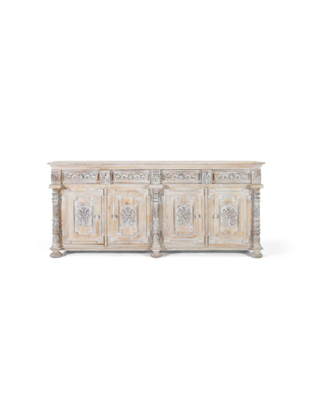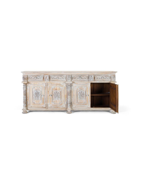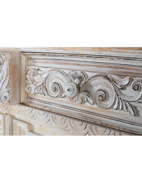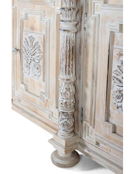 Aparador Amazonas 4 cajones y 4 puertas estilo hindú, ofrece amplio espacio de almacenamiento para tus necesidades diarias. Cada puerta y cajón está exquisitamente tallado en un estilo hindú, añadiendo un toque de intrincado detalle y elegancia a la pieza. Estos detalles tallados no solo son hermosos a la vista, sino que también añaden textura y dimensión al aparador, creando un punto focal impresionante en cualquier habitación. El acabado blanco desgastado añade un toque de encanto rústico y vintage al aparador, creando un ambiente cálido y acogedor en tu hogar. Las columnas talladas y las patas elevadas añaden un toque de altura y elegancia al diseño, mientras que los estantes internos proporcionan un espacio adicional para organizar y exhibir tus objetos más preciados.