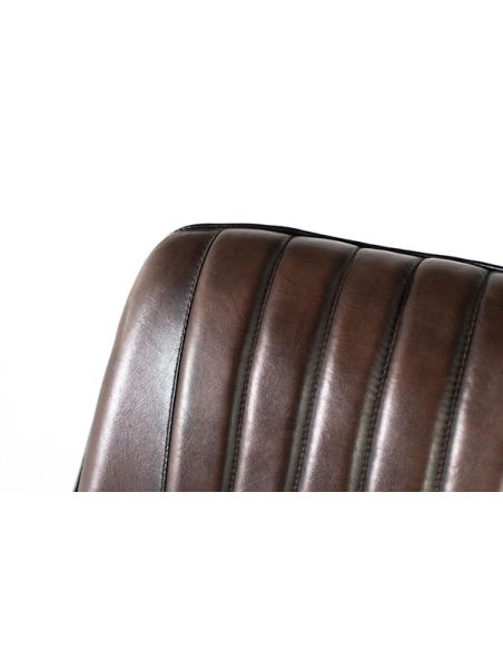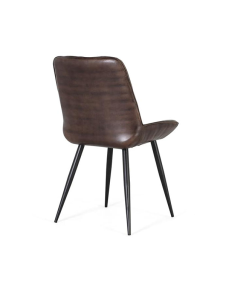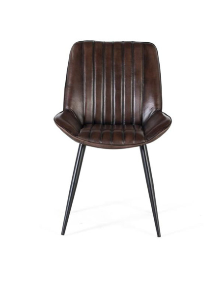 Silla acolchonada cuero marrón con líneas, una pieza de mobiliario que combina la comodidad del pasado con el diseño atemporal. Esta silla está meticulosamente tapizada en cuero marrón de alta calidad, que ofrece tanto un aspecto sofisticado como una sensación de lujo al tacto. El cuero está adornado con costuras verticales que no solo añaden un toque de detalle y elegancia, sino que también realzan el estilo vintage de la silla, evocando la artesanía tradicional y la atención al detalle de épocas pasadas. Estas costuras crean un patrón visualmente atractivo que añade profundidad y textura al diseño. Las patas delgadas en color negro proporcionan un contraste elegante con el cuero marrón, añadiendo un toque moderno y refinado a la silla. Con su estilo vintage y su acolchado cómodo, esta silla es perfecta para añadir un toque de elegancia y sofisticación a cualquier espacio de tu hogar. Ya sea que la utilices en el salón como una pieza de acento o en el estudio como una silla de lectura, esta silla será el centro de atención dondequiera que la coloques.