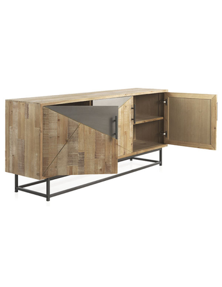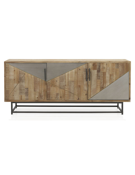 Aparador Cancún madera abeto con base en tubo metálico, una fusión perfecta entre estilo y funcionalidad. Este elegante mueble presenta una base robusta de tubo metálico que garantiza estabilidad y durabilidad. El frente del mueble está adornado con una cautivadora decoración con recortes grises. Los tiradores verticales metálicos en color gris oscuro complementan perfectamente el diseño, proporcionando un contraste sutil pero impactante. Con tres puertas con estantes, este aparador ofrece un espacio conveniente para organizar tus dispositivos multimedia, consolas de juego y otros accesorios. Además de su estética impresionante, la funcionalidad es una prioridad, permitiéndote mantener tu área de entretenimiento ordenada y bien organizada.