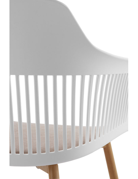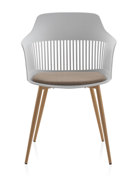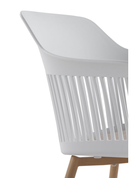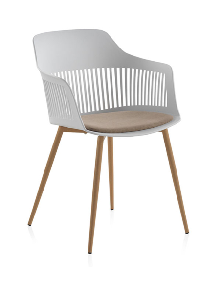 Set Ra 4 sillones pp blanco c/cojín con patas metálicas, compuesto por cuatro sillones de polipropileno blanco con un diseño contemporáneo y funcional. Cada sillón está equipado con un cómodo cojín acolchado de poliéster/algodón en color natural, proporcionando una experiencia de asiento excepcionalmente confortable. Las patas metálicas en un tono natural, simulando la apariencia de la madera, añaden un toque de calidez y modernidad al conjunto. Estas patas no solo brindan estabilidad, sino que también complementan perfectamente el diseño general del set. La estructura de polipropileno blanco está adornada con franjas lineales caladas en el contorno, agregando un toque de estilo y sofisticación al conjunto. Este detalle distintivo no solo añade interés visual, sino que también proporciona ventilación adicional para una mayor comodidad durante el uso.