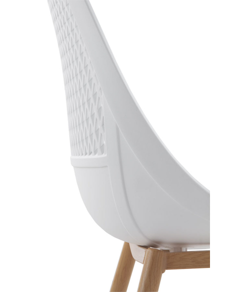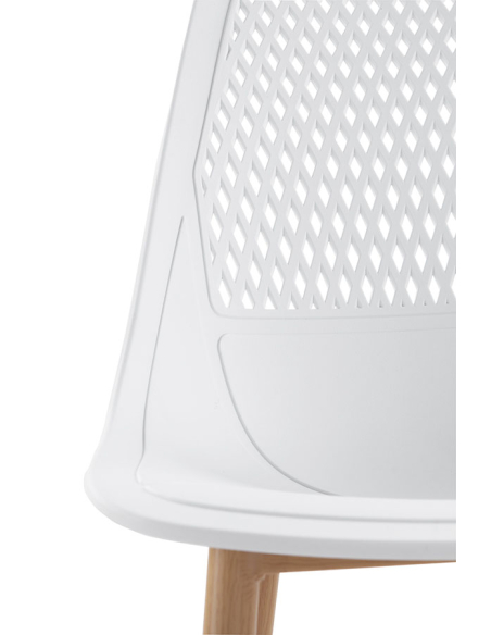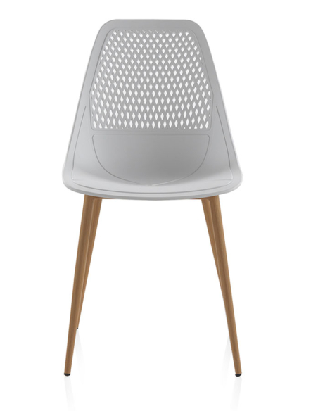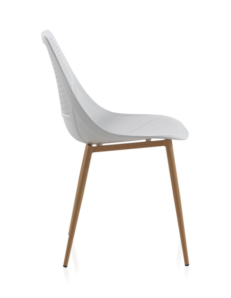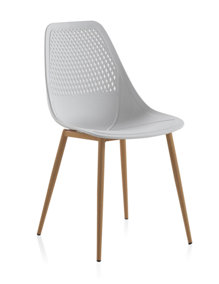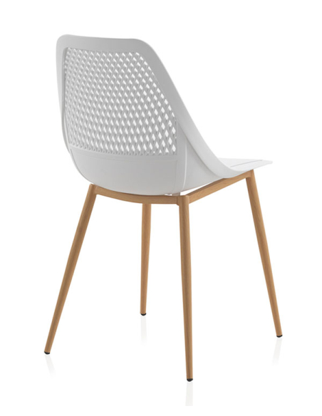 Set Odín 4 sillas pp blanco con patas metálicas, estas sillas están diseñadas para combinar estilo y funcionalidad, ofreciendo comodidad y durabilidad para cualquier ambiente. Las patas metálicas están habilidosamente pintadas en un tono natural, simulando la apariencia de la madera, lo que añade un toque de calidez y sofisticación al conjunto. Esta elección de diseño no solo proporciona estabilidad sólida, sino que también complementa a la perfección el aspecto general de las sillas. La estructura de polipropileno presenta elegantes diseños calados en la superficie, añadiendo un elemento de interés visual y modernidad al conjunto. Además, el respaldo de las sillas cuenta con un calado de rombos, que no solo ofrece un diseño atractivo, sino también una ventilación adicional para una mayor comodidad durante su uso.