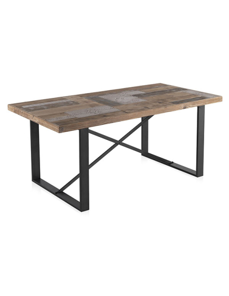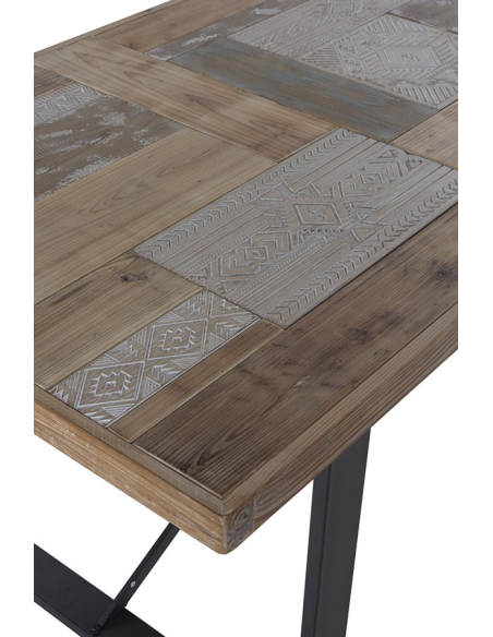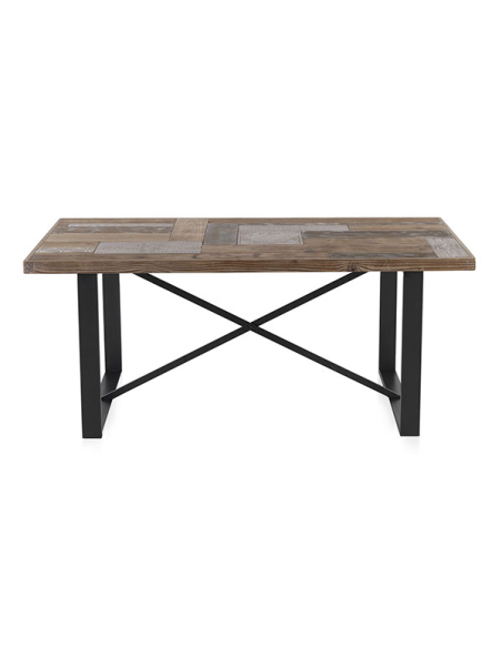 Mesa Freyr madera con patas metal 180x90 cm, con una combinación armoniosa de materiales naturales y detalles industriales, esta mesa es la pieza central perfecta para cualquier comedor o sala de estar. La tapa de madera, con sus listones irregulares de abeto en diferentes colores, añade un encanto único y una sensación de calidez a la mesa. Cada tablero con calados, resaltando la artesanía y el carácter individual de cada pieza. El acabado envejecido aporta un toque de nostalgia y autenticidad, creando una apariencia que evoca la pátina del tiempo. Las patas de metal negro, con una estructura reforzada en cruz, no solo ofrecen estabilidad y durabilidad, sino que también añaden un contraste moderno y elegante al diseño. Con unas dimensiones de 180x90 cm, esta mesa proporciona un generoso espacio para hasta 6 personas, invitando a compartir momentos inolvidables con familiares y amigos.
