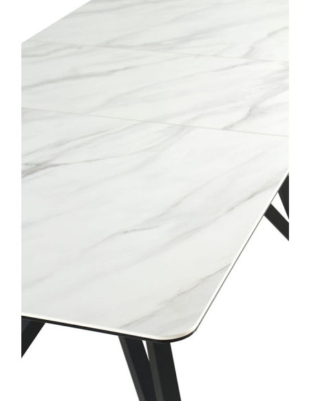Mesa Horus extensible cerámica blanca con patas metal 160/210x90 cm, esta mesa proporciona espacio suficiente para reunir a tus seres queridos en cualquier ocasión. Su sistema de apertura automático hace que la extensión sea rápida y sencilla, permitiéndote adaptar el tamaño según tus necesidades. Las patas de metal en color negro no solo ofrecen estabilidad y resistencia, sino que también añaden un toque de sofisticación y modernidad al diseño. Confeccionada con cerámica blanca de alta calidad en un tablero con efecto mármol, esta mesa es una obra de arte en sí misma. Con dimensiones de 160x90, que se extienden a 210x90 cuando es necesario. Con espacio suficiente para 8-10 personas, es perfecta para reuniones familiares o cenas con amigos.