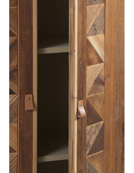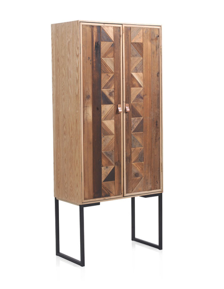 Vitrina Jano chapado fresno frontis madera reciclada base metal, esta vitrina es un testimonio de belleza natural y diseño sostenible. El frontal de la vitrina está adornado con lamas de madera reciclada en diferentes colores, añadiendo un toque de eclecticismo y originalidad a su diseño. Las dos puertas, con tiradores de cuero, no solo ofrecen un acceso conveniente, sino que también complementan la estética rústica y moderna de la vitrina. En su interior, la vitrina Jano contiene una balda para organizar y exhibir tus objetos más preciados de forma ordenada y elegante. La base metálica en color negro proporciona estabilidad y contraste visual, destacando la belleza de la madera reciclada.