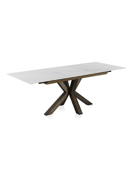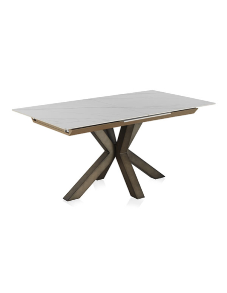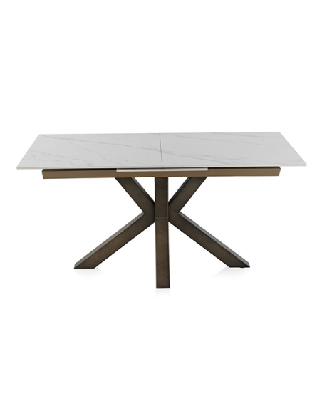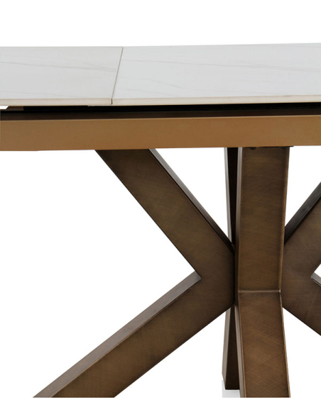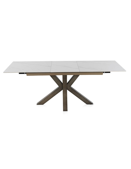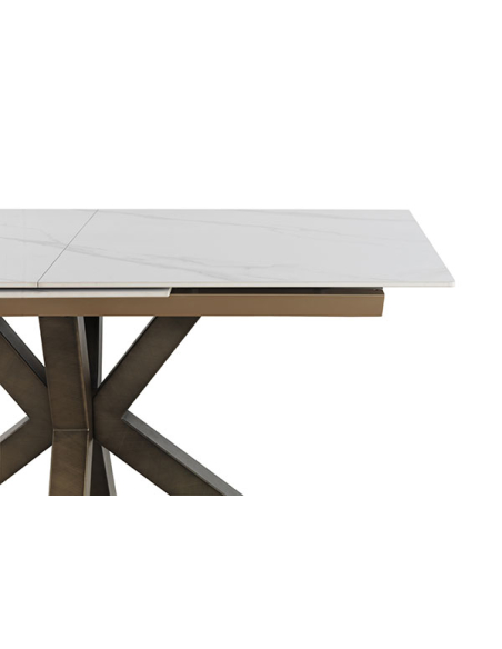 Mesa Marte blanca cerámica extensible 160/210x90 cm, con un tablero de cerámica imitación mármol blanco de 10 cm de grosor, esta mesa irradia lujo y sofisticación en cada detalle. Con unas dimensiones de 160/210x90 cm, esta mesa extensible ofrece un amplio espacio para acomodar cómodamente de 8 a 10 personas, lo que la convierte en la opción perfecta para cenas familiares o reuniones con amigos. El mecanismo de apertura y cierre automático garantiza una operación suave y sin esfuerzo, añadiendo conveniencia y practicidad a la experiencia de uso. Además, el pie metálico en color cobrizo proporciona estabilidad y resistencia, mientras que añade un toque de estilo y modernidad al diseño.