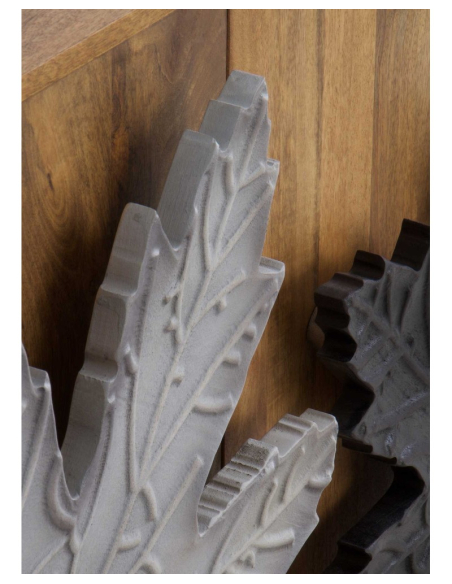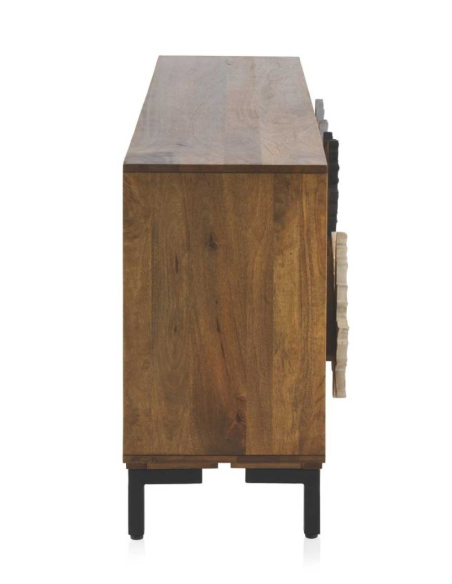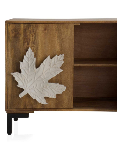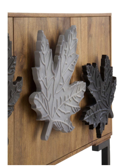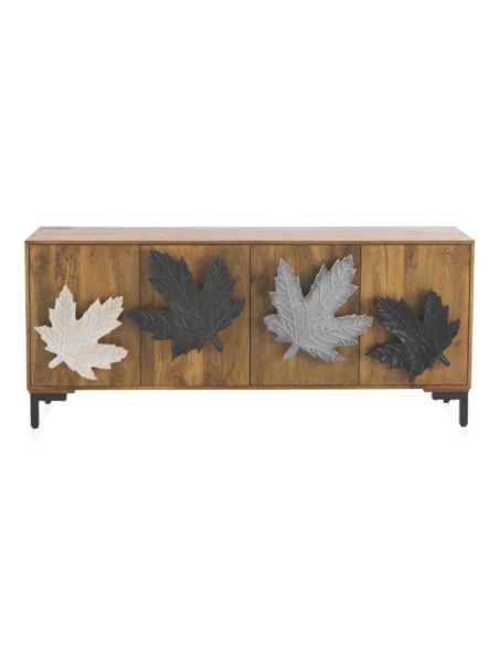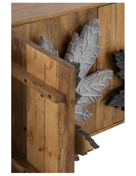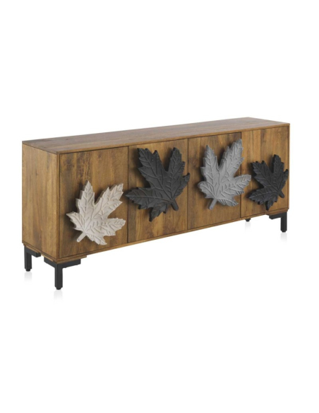 Aparador madera natural mango con 4 hojas de tiradores, es una pieza impresionante que combina la belleza rústica de la madera con la elegancia moderna. Con cuatro puertas adornadas con hojas de tiradores, este aparador es una expresión de estilo y funcionalidad en tu hogar. Las patas metálicas en color negro proporcionan estabilidad y un contraste visual llamativo, añadiendo un toque de modernidad al diseño. En su interior, encontrarás una balda fija a media altura que ofrece un amplio espacio de almacenamiento para organizar tus pertenencias. Los tiradores con forma de hojas gigantes añaden un detalle decorativo encantador, mientras que las bisagras de cierre suave garantizan un manejo suave y seguro de las puertas.