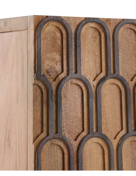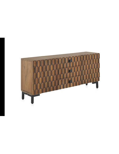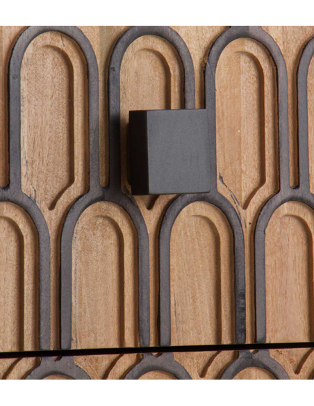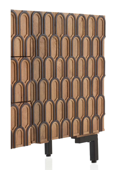 Aparador madera natural de mango escamas 2 puertas 3 cajones, con dos puertas decoradas con calados que evocan el efecto de escamas, este aparador es una declaración de estilo en cualquier espacio. Las patas metálicas negras proporcionan un soporte sólido y añaden un contraste visual moderno al diseño. En su interior, encontrarás una balda fija detrás de las puertas a media altura, ofreciendo un amplio espacio de almacenamiento para organizar tus pertenencias de manera ordenada. Los tiradores de madera negros complementan perfectamente el diseño y añaden un toque de sofisticación, mientras que las bisagras de cierre suave garantizan un manejo suave y silencioso de las puertas. Además, los tres cajones equipados con guías de madera ofrecen espacio adicional para guardar tus objetos más preciados de forma segura y organizada.