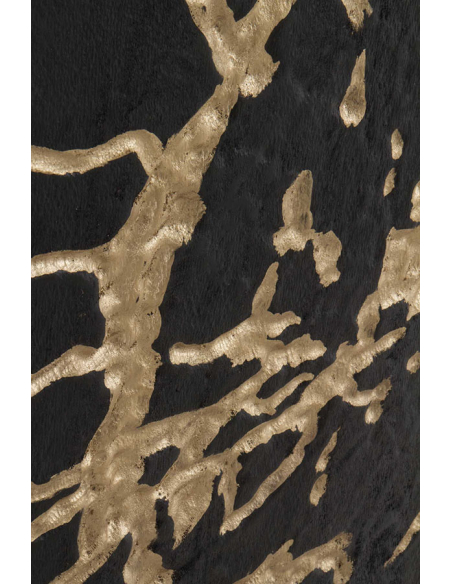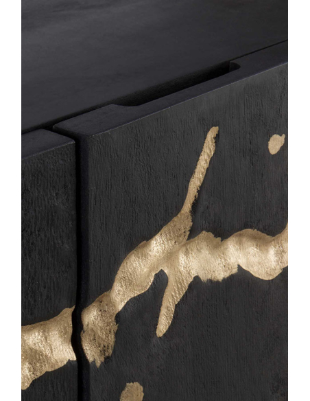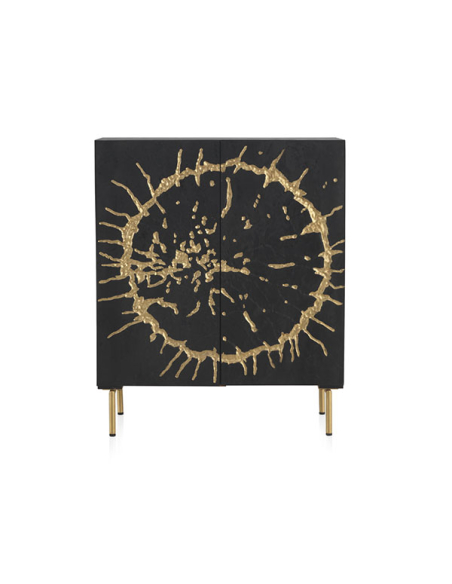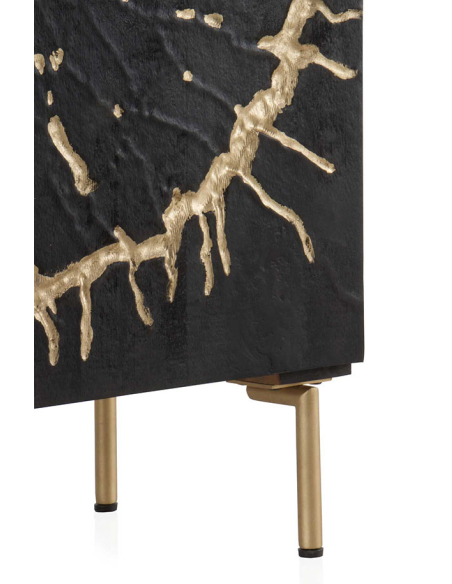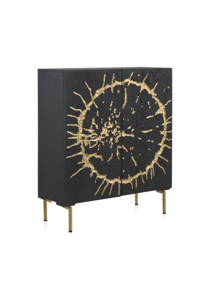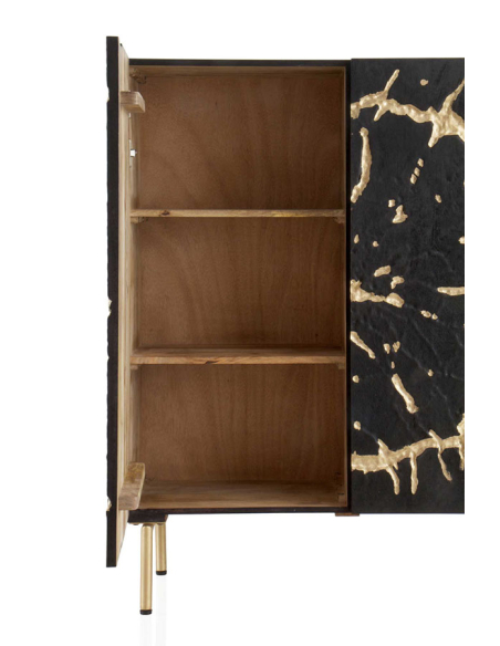 Aparador Sol alto mango negro 2 puertas y patas metal dorado, este aparador ofrece un equilibrio perfecto entre funcionalidad y sofisticación. Las patas metálicas doradas añaden un toque de lujo y glamour al diseño, elevando el aspecto general del aparador. En su interior, encontrarás dos baldas internas fijas que proporcionan un amplio espacio de almacenamiento para organizar tus pertenencias de manera ordenada y accesible. El frente de las puertas labrado con un diseño circular irregular y pintado en oro añade un elemento de estilo y elegancia al aparador, creando un punto focal visualmente cautivador en tu espacio. Además, las bisagras de cierre suave garantizan un manejo suave y silencioso de las puertas, añadiendo un toque de comodidad y elegancia al aparador.
