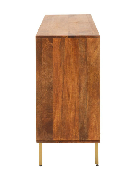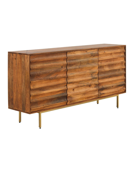 Aparador Juno 3 puertas madera maciza de mango, este aparador es una expresión de calidad artesanal y diseño contemporáneo. Destacando con tres puertas labradas con ondas en el frente, este aparador ofrece un aspecto único y llamativo que agrega un toque de originalidad a cualquier espacio. El labrado detallado añade textura y profundidad al diseño, creando un punto focal visualmente impresionante en tu hogar. En su interior, encontrarás una balda interior fija a media altura que proporciona un amplio espacio de almacenamiento para organizar tus pertenencias de manera ordenada y accesible. Además, las bisagras de cierre suave garantizan un manejo suave y silencioso de las puertas, añadiendo un toque de comodidad y elegancia al aparador.