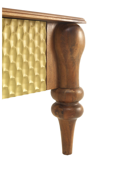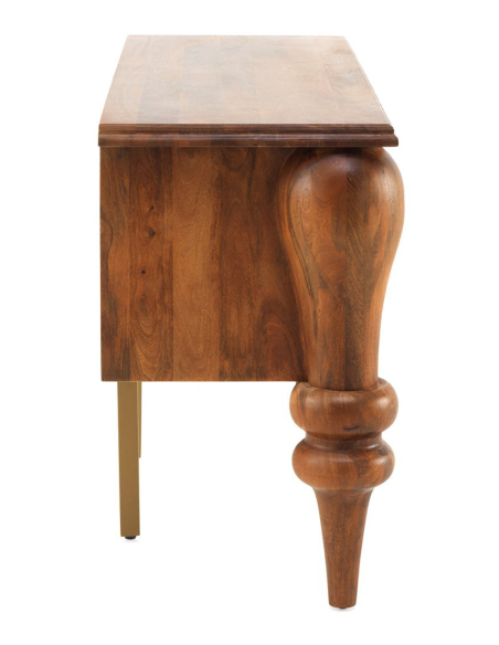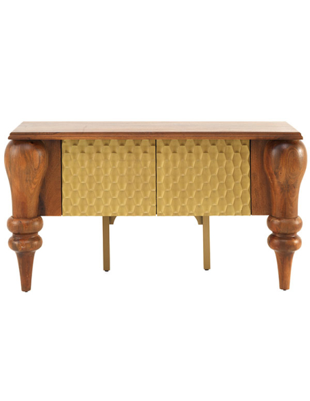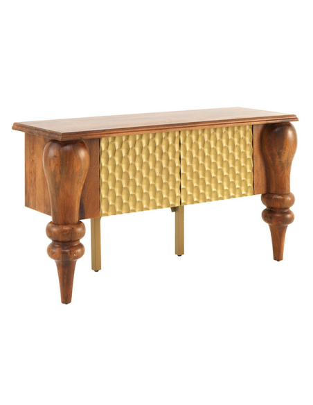 Aparador 2 puertas con patas torneadas de madera maciza, con un diseño extravagante y único, este aparador es una pieza de declaración que no pasará desapercibida. Las puertas de madera de mango con relieve geométrico y pintadas en oro viejo son el punto focal de este aparador, añadiendo un toque de opulencia y sofisticación al diseño. El relieve geométrico crea un efecto visual impresionante, mientras que el acabado en oro viejo añade un brillo lujoso y exuberante. En su interior, encontrarás una balda no fija que proporciona espacio de almacenamiento adicional para tus pertenencias. El sistema de apertura push y las bisagras de cierre suave garantizan un acceso fácil y cómodo a tus objetos mientras mantienen un funcionamiento suave y silencioso. Con patas torneadas de madera maciza que añaden un toque de elegancia clásica, este aparador es una pieza que combina lo tradicional con lo moderno de una manera extraordinaria.