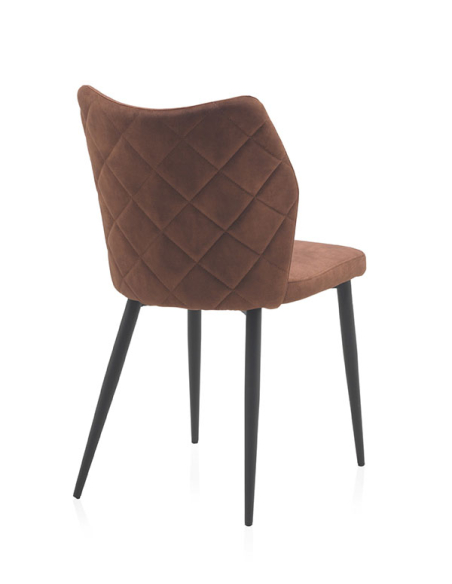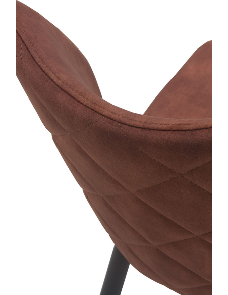 Silla Hermes tapizada color marrón patas metálicas negras, ideal para largas horas de reuniones, cenas o simplemente relajación en el hogar. La atención al detalle se hace evidente en la parte trasera del respaldo, donde las costuras en forma de rombo añaden un toque de sofisticación y refinamiento, elevando el aspecto general de la silla. Sus patas metálicas negras no solo proporcionan una base sólida y duradera, sino que también añaden un toque de contraste visual que complementa perfectamente su estética. Tapizado en un sofisticado tono marrón, resaltando su exquisita artesanía y diseño moderno.