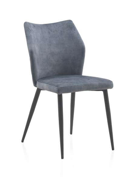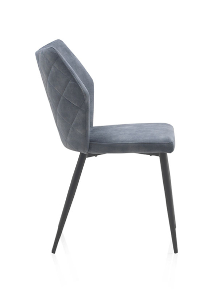 Silla Hermes tapizada color azul patas metálicas negras, ideal para largas horas de reuniones, cenas o simplemente relajación en el hogar. La atención al detalle se hace evidente en la parte trasera del respaldo, donde las costuras en forma de rombo añaden un toque de sofisticación y refinamiento, elevando el aspecto general de la silla. Sus patas metálicas negras no solo proporcionan una base sólida y duradera, sino que también añaden un toque de contraste visual que complementa perfectamente su estética. Tapizado en un sofisticado tono azul, resaltando su exquisita artesanía y diseño moderno.