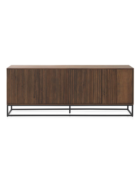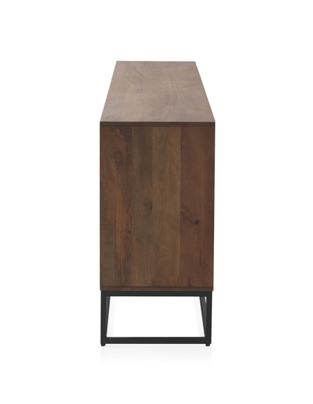 Aparador Eolo 4 puertas laminadas madera maciza de mango, ofrece la combinación perfecta de belleza natural y durabilidad, creando un punto focal elegante en cualquier habitación. Experimenta la conveniencia y modernidad con el sistema de apertura push, que permite acceder rápidamente al contenido almacenado en su interior, sin necesidad de tiradores visibles que rompan su estética limpia y minimalista. Además, el frente de las puertas presenta un relieve vertical que agrega textura y estilo, añadiendo un toque de distinción visual a tu espacio. El montaje es rápido y sencillo, ya que solo requiere fijar la base del pie, lo que te permite disfrutar de tu nuevo aparador sin complicaciones adicionales. La base metálica en color negro proporciona estabilidad y resistencia, mientras que las bisagras de cierre suave garantizan un funcionamiento silencioso y seguro.