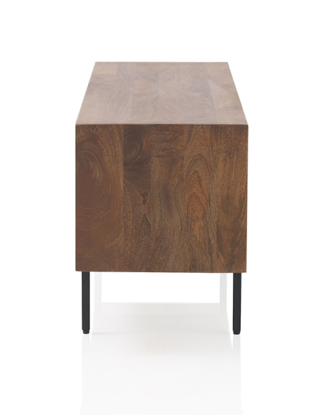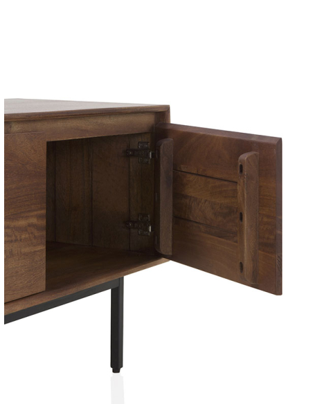 Aparador Iris bajo 3 puertas lisas madera maciza de mango, con bisagras de cierre suave, que aseguran un movimiento silencioso y seguro al abrir y cerrar las puertas. Además, la apertura de puertas tipo uñero proporciona un aspecto elegante y sin complicaciones, manteniendo la estética pulida del aparador. En el interior, encontrarás un estante a media altura detrás de cada puerta, ofreciendo un amplio espacio de almacenamiento y organización para tus pertenencias. Esto te permite mantener tus objetos personales fuera de la vista y bien organizados, sin sacrificar la accesibilidad. El montaje es rápido y sencillo, ya que solo necesitas fijar la base del pie, lo que te permite disfrutar de tu nuevo aparador sin demoras innecesarias. La base de metal en color negro proporciona estabilidad y durabilidad, añadiendo un toque de contraste visual al diseño general del aparador.
