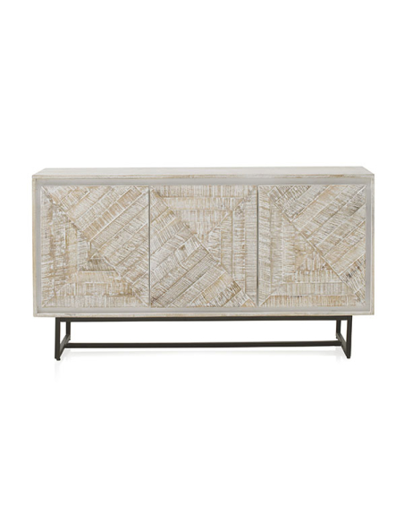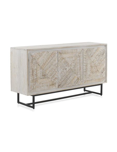 Aparador Frigg 3 puertas de madera de mango blanco patinado, ofrece una estética elegante y atemporal que seguramente impresionará. Disfruta de la comodidad y la elegancia de las puertas con apertura tipo uñero, que ofrecen un acceso suave y sin esfuerzo al amplio espacio de almacenamiento interior. El frente de las puertas presenta un ligero relieve que añade textura y profundidad visual, agregando un toque de distinción al diseño general del aparador. En su interior, encontrarás estantes a media altura detrás de cada puerta, proporcionando un espacio organizado y accesible para tus pertenencias. Además, las bisagras de cierre suave garantizan un movimiento silencioso y seguro al abrir y cerrar las puertas, añadiendo un toque de lujo a tu experiencia diaria. El montaje es rápido y sencillo, ya que solo necesitas fijar la base del pie, lo que te permite disfrutar de tu nuevo aparador sin complicaciones adicionales. La base de metal negro añade un contraste moderno y sofisticado, completando el aspecto elegante y refinado del aparador Frigg.