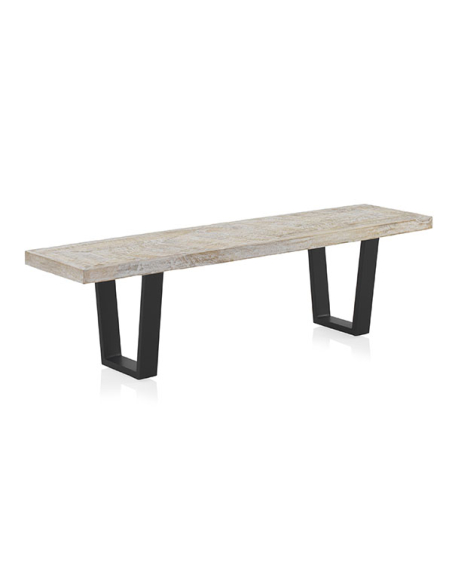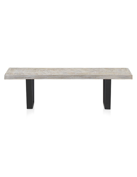 Banco Frigg madera de mango en color blanco patinado, presenta un tablero con un ligero relieve que añade textura y profundidad visual, realzando su belleza natural. Las patas metálicas en color negro proporcionan estabilidad y resistencia, mientras añaden un toque de contraste moderno y sofisticado al diseño. El montaje es rápido y sencillo, ya que solo necesitas fijar las patas para empezar a disfrutar de tu nuevo banco. La madera maciza de mango natural garantiza una durabilidad excepcional y una belleza que perdura a lo largo del tiempo, convirtiendo al banco Frigg en una inversión que disfrutarás durante años.