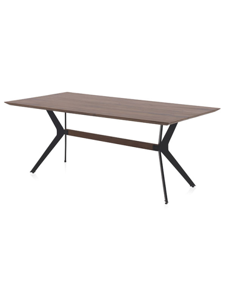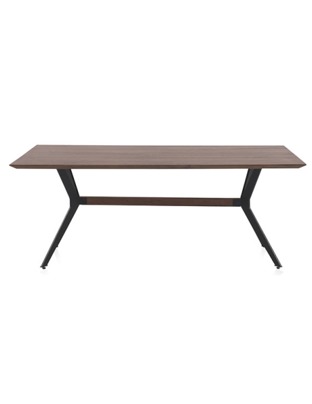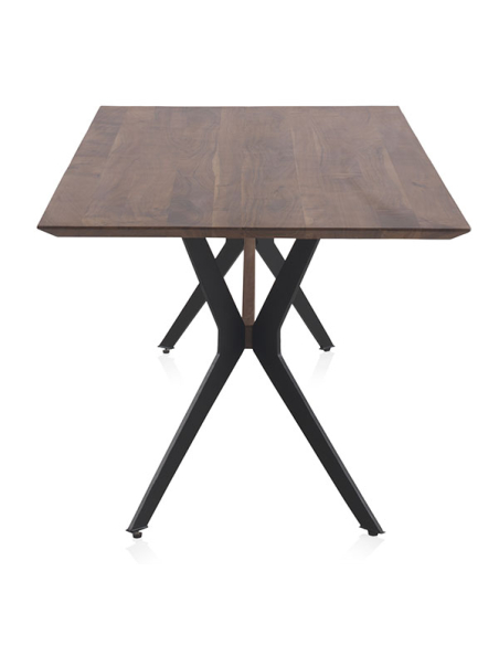 Mesa comedor 200x100 cm de madera maciza de acacia con el sobre de 35 mm, presenta bordes irregulares en los lados largos que realzan su aspecto natural y auténtico. Las vetas de la madera son visibles, añadiendo un toque de textura y carácter a la mesa. Las patas negras en forma de X con soporte cruzado proporcionan una base sólida y estable, mientras añaden un toque de elegancia industrial al diseño. Esta combinación de materiales y formas crea una estética moderna y sofisticada que complementa una variedad de estilos de decoración. Con espacio para 8 o 10 personas.