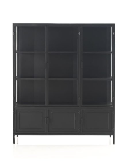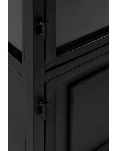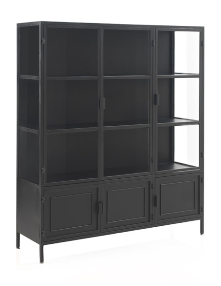 Vitrina Hebe puertas y laterales cristal estructura metal negro, esta vitrina permite exhibir tus objetos favoritos con estilo y elegancia. La estructura de metal negro proporciona un soporte sólido y resistente, mientras que los tacos finales de los pies son regulables en altura, lo que te permite nivelar la vitrina en superficies irregulares. Además, las baldas interiores son fijas, ofreciendo una plataforma estable para tus artículos de exposición. El diseño de la vitrina Hebe incluye un estante oculto en la parte inferior, que te ofrece espacio adicional para almacenar artículos menos decorativos o para ocultar elementos que prefieras mantener fuera de la vista. Además, esta vitrina se suministra en un solo bulto y no requiere montaje, lo que facilita su instalación y uso inmediato.
