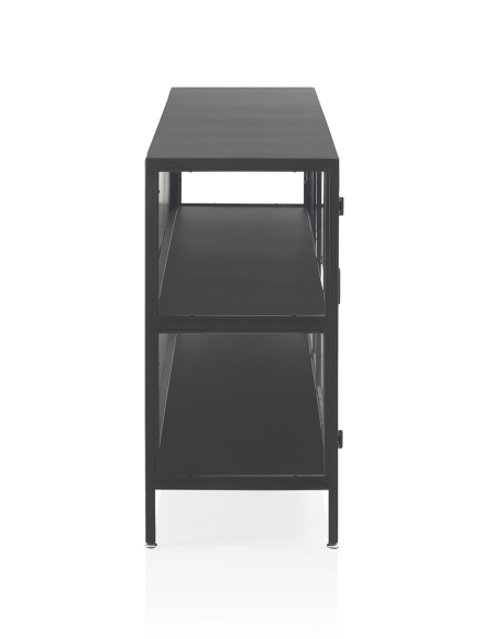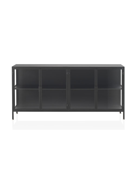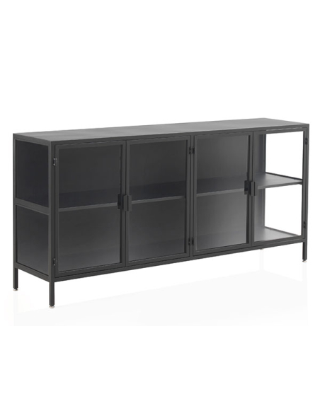 Aparador Hebe puertas y laterales cristal estructura metal negro, permite exhibir tus objetos decorativos con un toque de clase y distinción. La estructura de metal negro proporciona un soporte robusto y elegante, mientras que los tacos finales de los pies son regulables en altura, garantizando una estabilidad perfecta incluso en superficies irregulares. Además, las baldas interiores son fijas, ofreciendo un espacio organizado y seguro para tus pertenencias. Con un diseño que destaca por su elegancia y funcionalidad, el aparador Hebe no requiere montaje, lo que facilita su instalación y uso inmediato en tu hogar u oficina. Este mueble es una opción ideal para quienes buscan combinar estilo y practicidad sin comprometer la calidad.