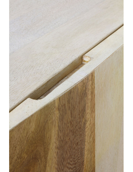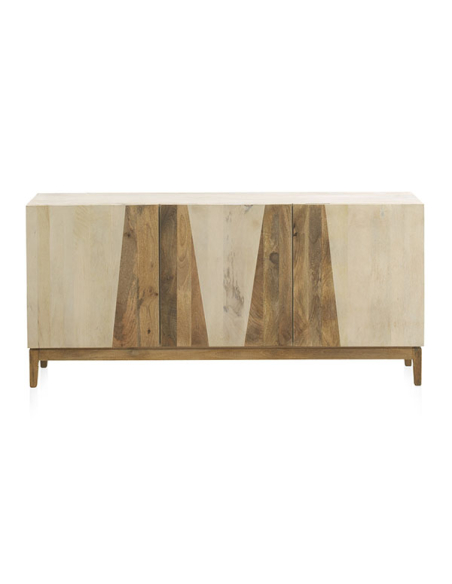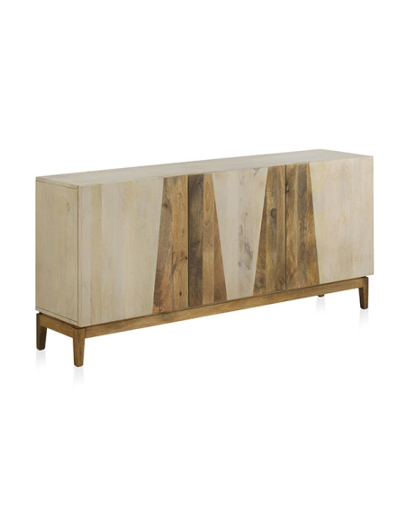 Aparador en mango color blanco patinado con patas de madera, presenta un diseño refinado con tres puertas que capturan la esencia del estilo clásico. Las bisagras de cierre suave aseguran un funcionamiento sin esfuerzo y silencioso, añadiendo un toque de lujo a cada movimiento. Además, las puertas presentan recortes que combinan madera oscura y clara, creando un efecto visual cautivador que resalta la belleza natural del mango. Las patas de madera añaden un toque de calidez y estabilidad al diseño, mientras que la base, a contraste, presenta tonos oscuros que realzan la elegancia y el carácter del aparador. Con su amplio espacio de almacenamiento, este mueble es perfecto para organizar y exhibir tus objetos más preciados en cualquier ambiente de tu hogar. Además, su montaje es rápido y sencillo, con las patas y los tornillos necesarios incluidos en el paquete, lo que te permite disfrutar de tu nuevo mueble en poco tiempo y sin complicaciones.