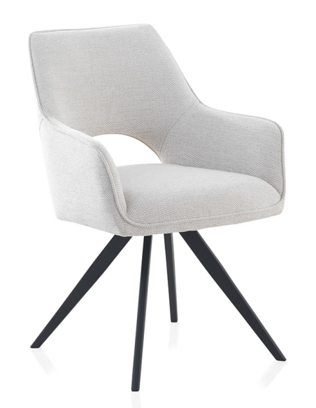 Sillón Hel tapizado giratorio beige con patas metálicas negras, diseño contemporáneo con un tejido tapizado 100% poliéster, que brinda una sensación suave y acogedora al tacto, ideal para relajarte después de un largo día. Con su estructura cuadrada y apoya brazos integrados, el Sillón Hel ofrece un soporte ergonómico para tu cuerpo, permitiéndote disfrutar de momentos de descanso en total comodidad. Las patas metálicas en color negro añaden un toque de modernidad y estabilidad al diseño del sillón, mientras que su función giratoria con retorno a posición inicial te permite moverte con facilidad y volver a tu posición favorita con un solo movimiento. Además, el respaldo presenta una abertura en la base que no solo agrega un elemento visual interesante, sino que también proporciona una ventilación adicional para una experiencia de descanso fresca y confortable.