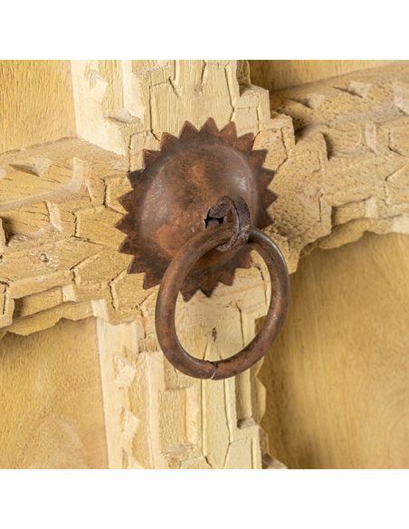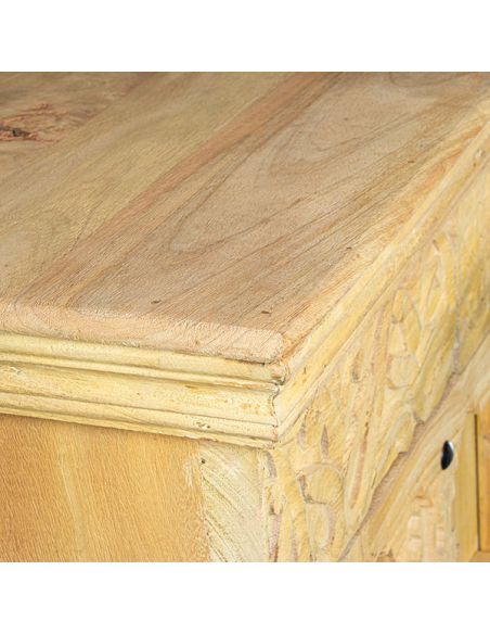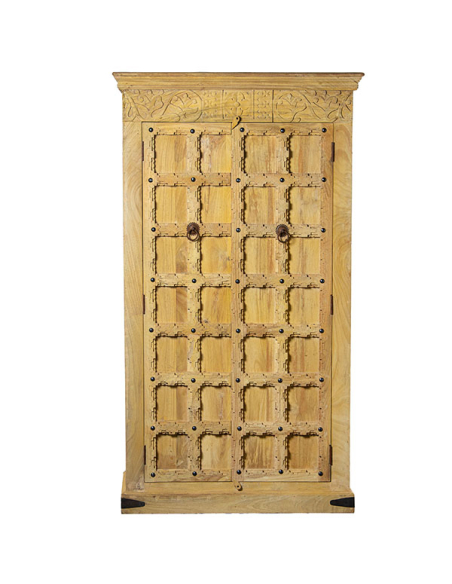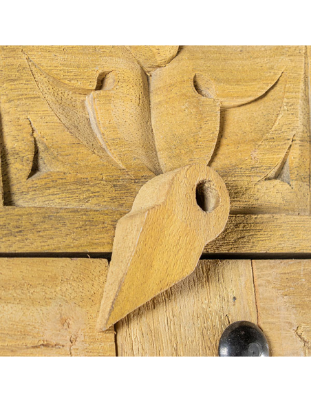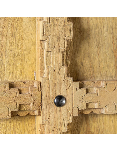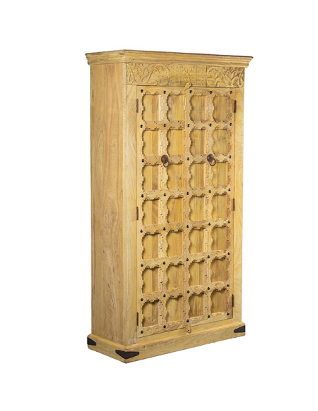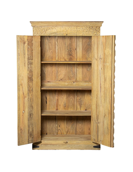 Armario Peruvian dos puertas, fabricado con madera de mango, presenta una base entera elevada que le da una apariencia robusta y elegante. Las dos puertas, con detallados tallados cuadrados en un hermoso color natural, muestran la autenticidad y el encanto de la madera. Equipado con tiradores redondos de metal con argolla, el armario combina practicidad con un toque de sofisticación. En su interior, las puertas ocultan estantes espaciosos que ofrecen un generoso espacio de almacenamiento. Los detalles metálicos en los laterales de la base aportan un toque moderno, mientras que el calado en la parte superior del frente agrega una característica decorativa distintiva. Este armario es ideal para quienes buscan una pieza de mobiliario que combine funcionalidad y diseño artesanal en cualquier habitación.