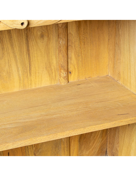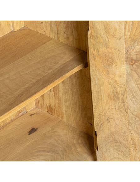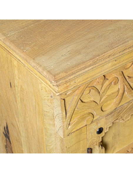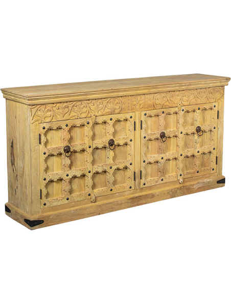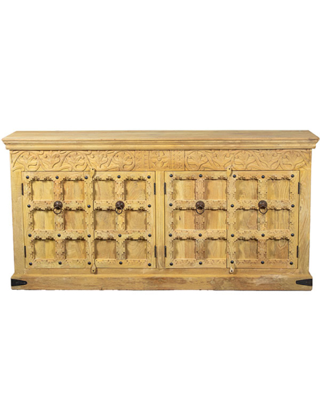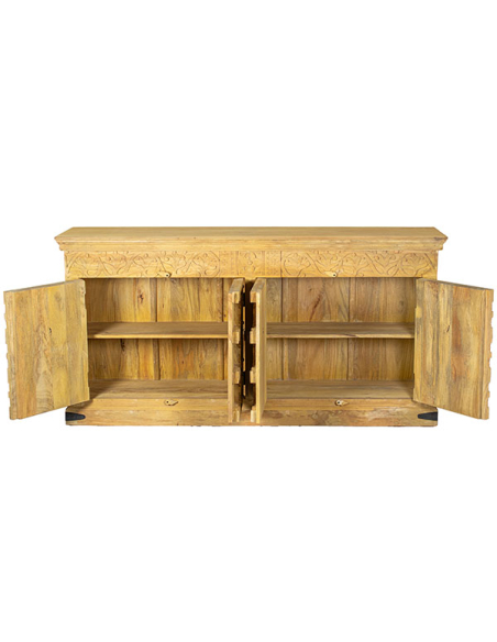 Aparador Peruvian 4 puertas calado en superficie, construido con madera de mango, se destaca por su base entera elevada que proporciona una estructura sólida y elegante. Sus cuatro puertas cuentan con intrincados tallados cuadrados en un hermoso color natural que realza la belleza de la madera. Los tiradores redondos de metal con argolla añaden un toque de sofisticación y funcionalidad. Cada puerta, equipada con estantes internos, ofrece un amplio espacio de almacenamiento para tus pertenencias. Los detalles metálicos en los laterales de la base aportan un contraste moderno, mientras que el calado en la parte superior del frente añade un elemento decorativo único y atractivo. Este aparador es perfecto para quienes buscan una combinación de estilo, funcionalidad y artesanía en su hogar.