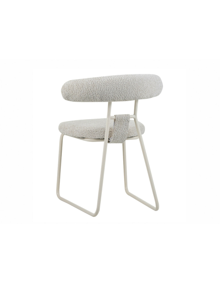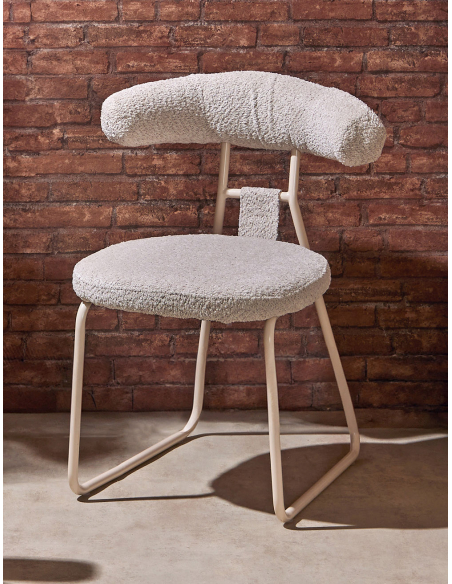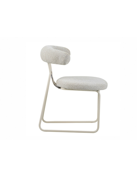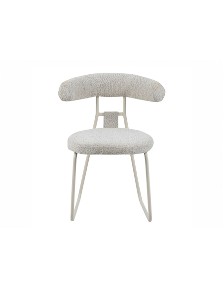Silla Kirk rizo suave beige, combina una estructura de caño en color beige con un estilo único y contemporáneo. Su respaldar pequeño en la parte superior proporciona un soporte delicado, mientras que el asiento redondeado invita a la comodidad. Tanto el respaldo como el asiento están acolchonados y tapizados con un suave textil en un tono beige, que aporta calidez y elegancia. Ideal para comedores, salas de estar o estudios, esta silla es perfecta para quienes buscan un mueble funcional y estilizado que realce la decoración de su hogar.