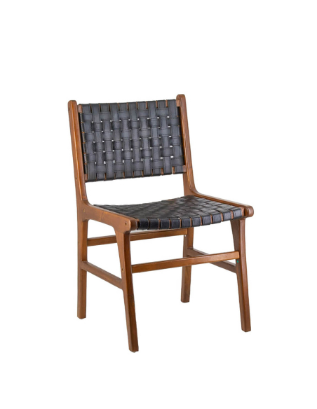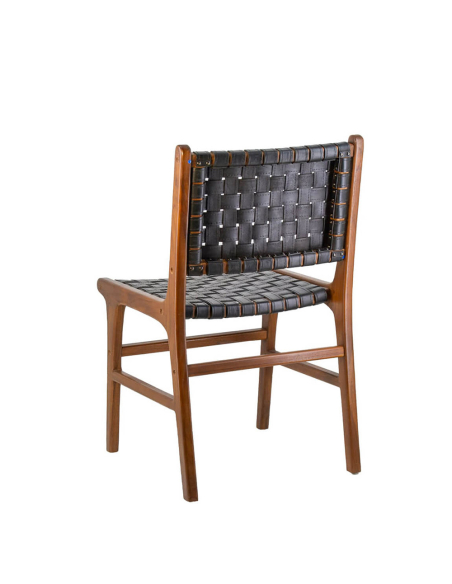 Silla piel negra trenzada, combina robustez y elegancia, gracias a su estructura de madera sólida y base reforzada que garantiza estabilidad y durabilidad. El respaldo y asiento están confeccionados con cuero trenzado en color negro, con costuras al tono que añaden un toque de sofisticación y detalle artesanal. Ideal para comedores, oficinas o cualquier espacio que requiera una pieza funcional y con carácter, esta silla ofrece un diseño atemporal que se adapta perfectamente a estilos modernos y clásicos.