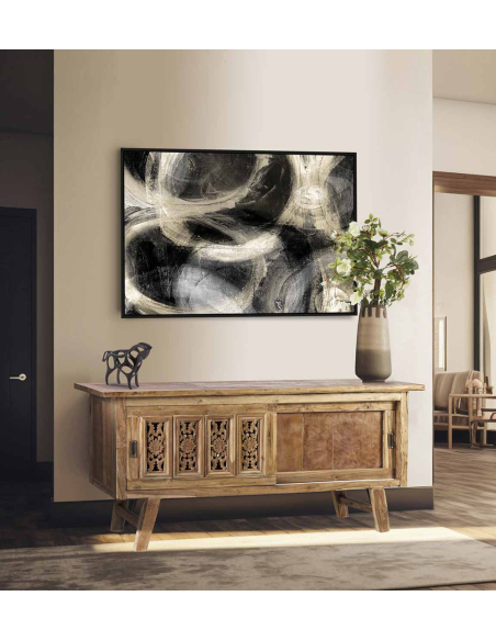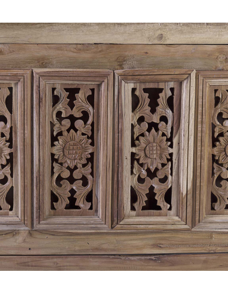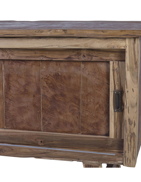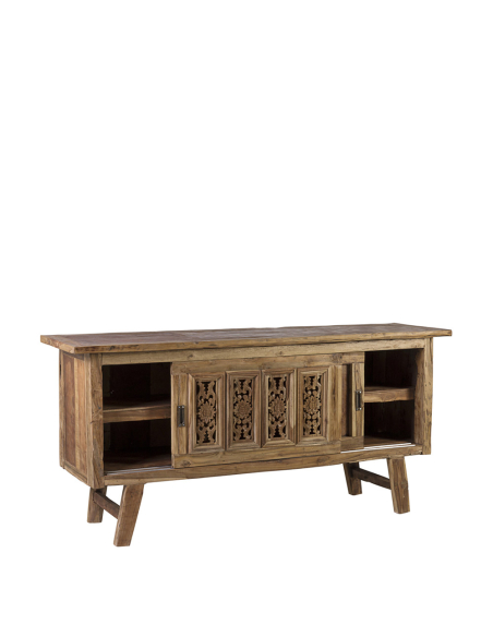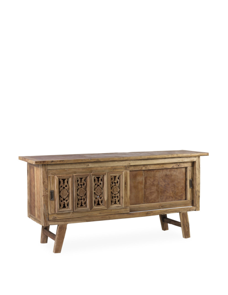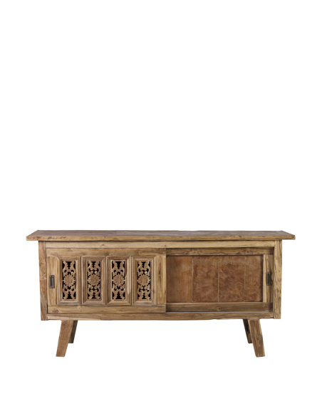Aparador buffet talla con puerta corredera, es una pieza única con un diseño elegante y funcional. Sus patas elevadas, reforzadas con un soporte horizontal, aportan estabilidad y estilo. En el frente, presenta dos puertas corredizas: una con cuatro diseños calados dispuestos verticalmente, y la otra con listones de madera lisos, creando un contraste de texturas que enriquece la estética. Los tiradores de metal verticales complementan su diseño contemporáneo. La tapa rectangular y el estante interno brindan amplio espacio de almacenamiento, convirtiéndolo en una opción ideal para cualquier comedor o sala de estar.