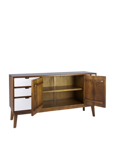 Aparador buffet Artic 6 cajones 2 puertas, con un diseño funcional y elegante, ideal para organizar y almacenar. En el lateral, cuenta con tres amplios cajones que ofrecen gran capacidad, mientras que en el extremo opuesto, tres cajones más pequeños brindan un espacio adicional para artículos más pequeños. En el centro, se encuentra un conjunto de dos puertas que abren a un estante interno, perfecto para guardar objetos más grandes o decorativos. Las patas elevadas proporcionan un toque moderno y permiten fácil acceso a la parte inferior, manteniendo un diseño limpio y aireado.