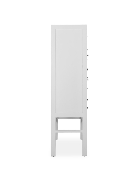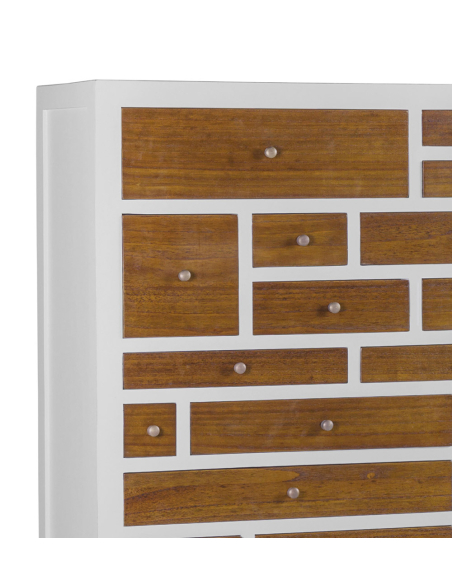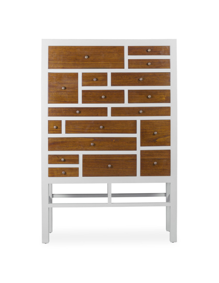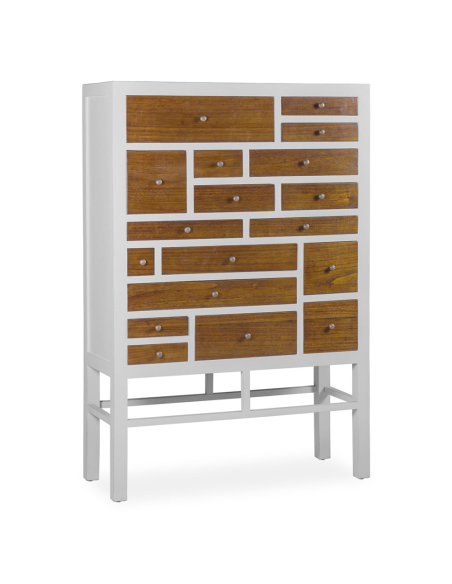 Cajonera 18 cajones blanca, de diseño cuadrado con patas elevadas que proporcionan una sensación de ligereza. La estructura, reforzada y rectangular, es completamente en color blanco, lo que la hace moderna y elegante. En la parte superior, cuenta con 18 cajones de distintos tamaños, cada uno con un frente de madera que aporta contraste y textura al diseño. Los tiradores de metal redondos en tono bronce viejo añaden un toque clásico y sofisticado. Esta pieza es perfecta para aquellos que buscan funcionalidad y estilo en un solo mueble, brindando amplio espacio de almacenamiento con un toque de distinción.