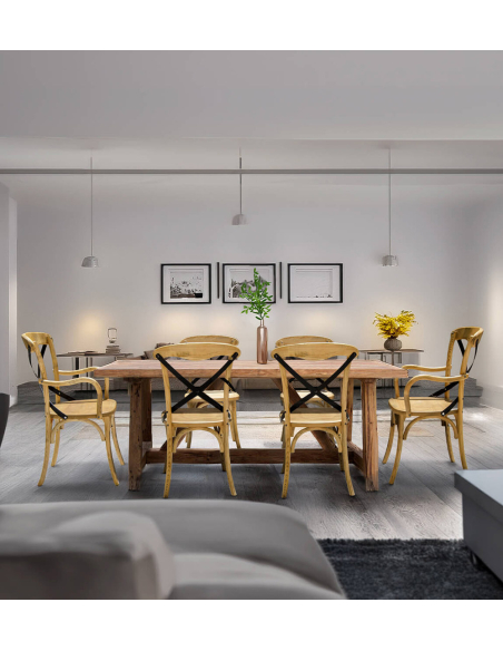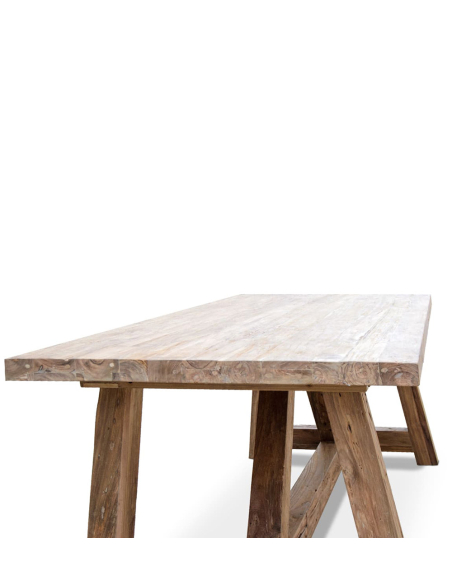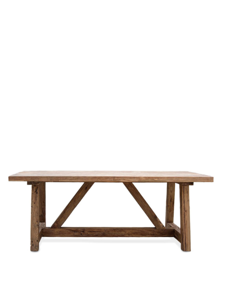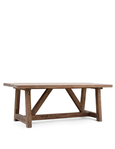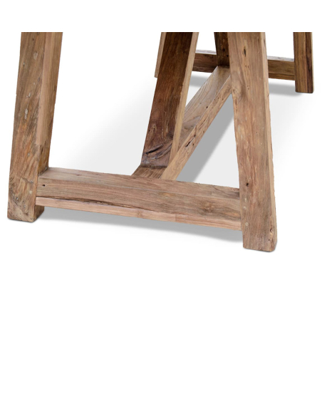 Mesa de comedor Orlando teka reciclada, construida con madera de teka reciclada, es la opción perfecta para quienes aprecian el estilo rústico y la sostenibilidad. Su diseño robusto y duradero presenta un refuerzo en la parte inferior y la base, asegurando estabilidad y resistencia a lo largo del tiempo. El acabado de la madera, que deja ver el desgaste natural y las vetas características, añade una belleza auténtica y única a la pieza, haciendo que cada mesa sea irrepetible. Ideal para crear un ambiente cálido y acogedor, esta mesa es perfecta para cenas familiares o reuniones en un espacio de estilo rústico o industrial.