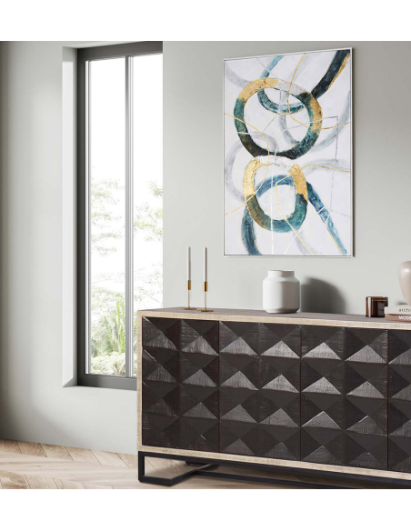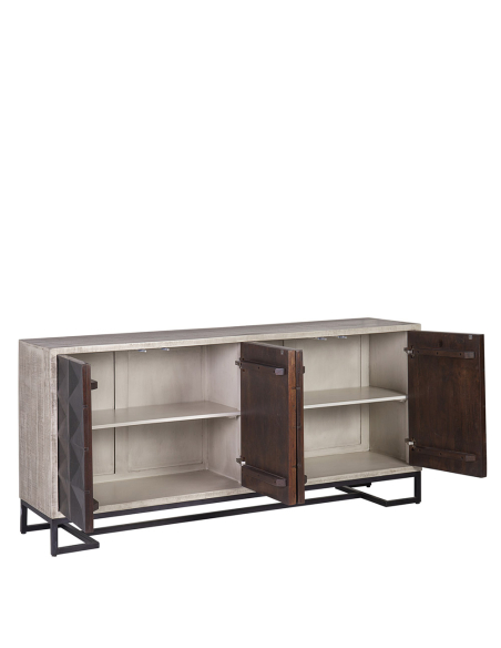 Aparador buffet Gatsby 4 puertas negro, es una pieza moderna y elegante que aportará estilo a cualquier espacio. Su base elevada de metal le da un toque contemporáneo y ligero, mientras que su estructura en color claro crea un contraste perfecto con las puertas en color marrón. Las cuatro puertas están equipadas con un estante interno, ofreciendo amplio espacio de almacenamiento. Los detalles geométricos tallados en las puertas añaden un toque artesanal y distintivo, realzando su diseño único. Los herrajes de metal completan el look, proporcionando durabilidad y un acabado refinado. Ideal para quienes buscan un equilibrio entre modernidad y funcionalidad en su hogar.