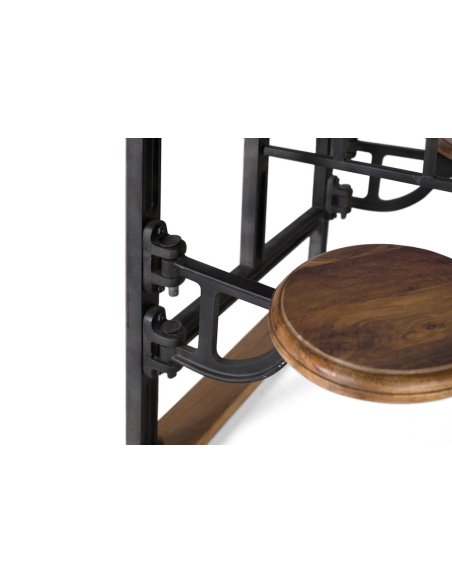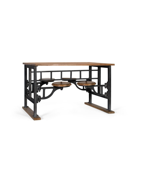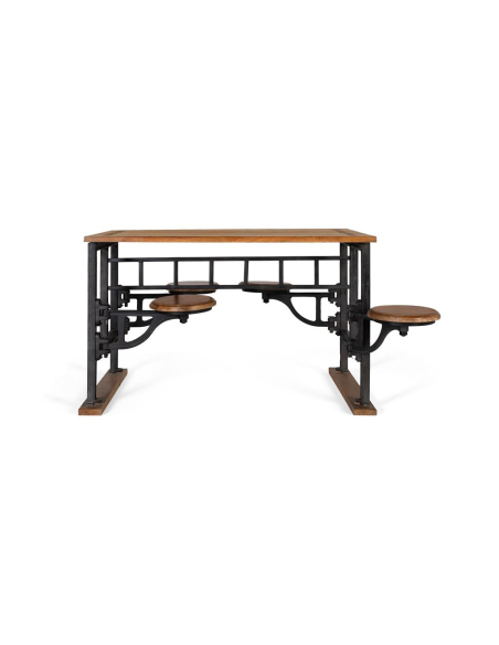Mesa de comedor Ingenio, de madera de mango con diseño original y auténtico. Esta mesa combina una sólida tapa rectangular de madera de mango con listones decorativos en la base, creando un estilo rústico y contemporáneo. Las patas de hierro negro aportan un toque industrial y aseguran estabilidad. Lo más destacado de este diseño son los cuatro asientos redondos integrados, cada uno con tapa de madera y un ingenioso sistema que permite girarlos para su uso o guardarlos discretamente debajo de la mesa. Ideal para espacios funcionales que buscan estilo y practicidad en una sola pieza.