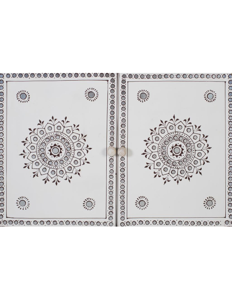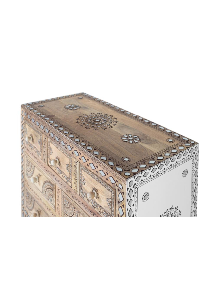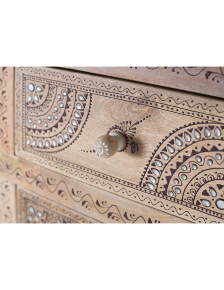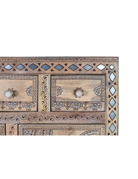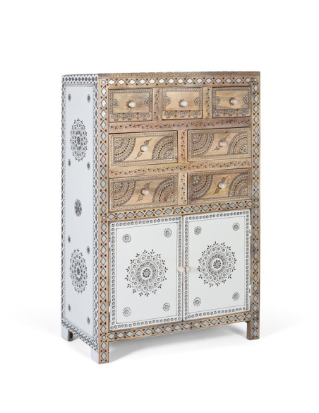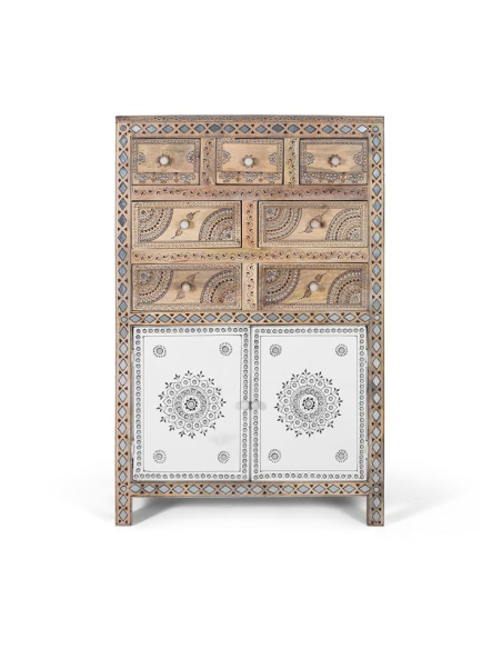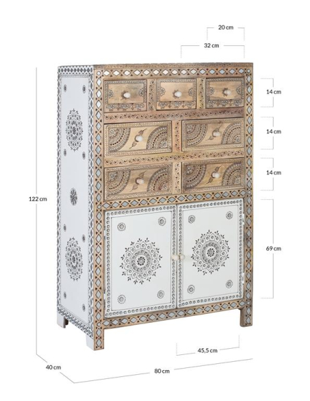 Aparador alto blanco, fabricado en una combinación de madera de mango y MDF, con una pintura a mano que resalta su belleza y detalle. Este aparador presenta siete cajones de diferentes tamaños en la parte superior, ideales para organizar diversos objetos, cada uno con tiradores redondos que complementan perfectamente su estilo. En la parte inferior, se encuentran dos puertas que brindan un amplio espacio de almacenamiento adicional, mientras que las patas elevadas no solo mejoran su estabilidad, sino que también aportan un toque de ligereza y elegancia al diseño general. La pintura a mano cubre toda la superficie, lo que le da un acabado único y detallado, transformando este aparador en una pieza funcional y decorativa perfecta para cualquier habitación.