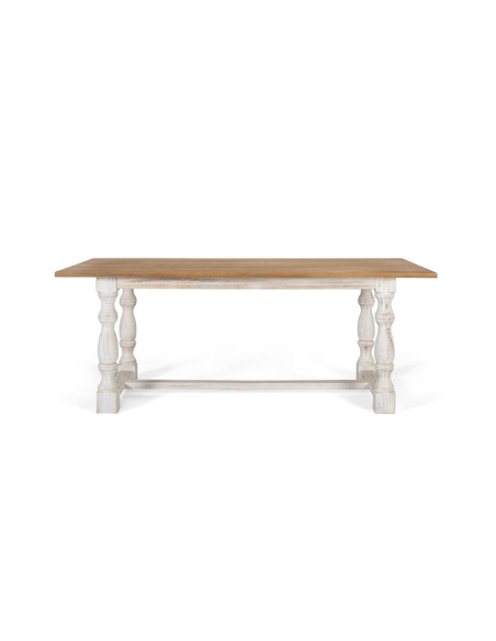 Mesa de comedor patas blancas decape, presenta una robusta tapa rectangular de madera de mango en acabado natural, que contrasta maravillosamente con su base y patas torneadas pintadas en blanco decapado. Esta combinación crea una pieza llena de calidez, elegancia campestre y un aire fresco y luminoso. Los detalles realzan su encanto: las cuatro patas, trabajadas con formas torneadas clásicas, y el acabado blanco envejecido le confieren personalidad y un toque vintage. La sólida tapa de madera natural muestra la belleza de las vetas del mango, mientras que la estructura con travesaños inferiores asegura una excelente estabilidad para tus comidas y reuniones. Ideal para comedores de estilo provenzal, shabby chic, farmhouse o rústico contemporáneo, esta mesa se convierte en un punto de encuentro cálido y familiar. Aporta luminosidad, carácter y la belleza atemporal de los muebles hechos para durar y compartir.