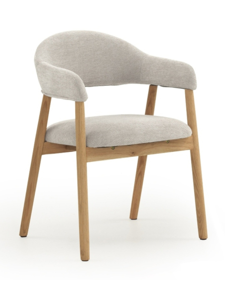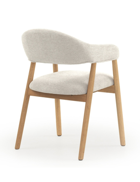 Set 4 sillones Poniente en madera roble tapizado blanco, combinan una sólida estructura de madera de roble macizo en acabado natural con un asiento y respaldo tapizados en un suave tejido de chenilla color blanco. El diseño destaca por sus líneas curvas y envolventes, con reposabrazos integrados que invitan a la comodidad. Pensados para largas sobremesas, el asiento y el respaldo cuentan con un acolchado de alta densidad (30 kg/m3 y 24 kg/m3 respectivamente), garantizando un confort óptimo. La calidez de la madera de roble natural contrasta bellamente con la luminosidad del tapizado blanco, creando una estética fresca, acogedora y muy actual. Este set es perfecto para comedores de estilo escandinavo, moderno o contemporáneo. Los sillones Poniente no solo son visualmente atractivos, sino que también ofrecen una sentada ergonómica y confortable, convirtiendo tu comedor en un espacio acogedor y lleno de estilo.