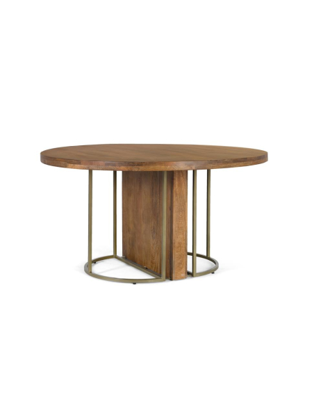 Mesa de comedor Prestissimo negro, eleva tu zona de comidas con un diseño escultórico y atemporal. Su sobre redondo de madera de mango en tono avellana descansa sobre una base central formada por paneles de madera y varillas de hierro acabado dorado suave, aportando estabilidad y un toque de lujo contemporáneo. Las líneas curvas favorecen la circulación y crean un ambiente acogedor, ideal tanto para pisos urbanos como para casas familiares. La combinación de materiales nobles y metal cepillado armoniza con estilos modernos, mid-century o eclécticos. Fácil de integrar con sillas tapizadas o de madera, es una pieza protagonista que resiste el uso diario y realza cualquier comedor.