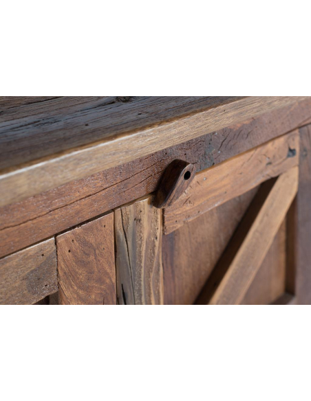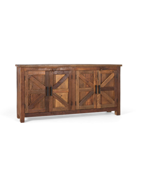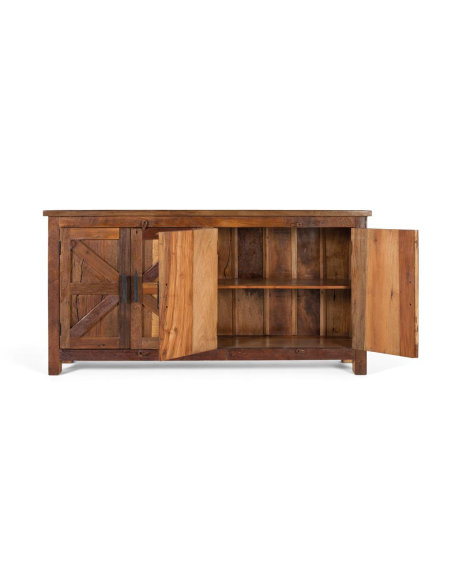 Aparador Obertura rústico, de espíritu rústico e industrial, este aparador está construido con madera reciclada que conserva marcas y tonalidades únicas. Sus puertas de marco y crucetas, herrajes metálicos y tiradores robustos le dan presencia, mientras que el interior con estante continuo permite organizar desde vajilla pesada hasta libros y textiles. En el comedor aporta calidez de campo; en el living sostiene equipos y objetos decorativos; en la cocina suma espacio de guardado extra con carácter. Combínalo con lámparas metálicas, alfombras tejidas y piezas de cerámica para un ambiente auténtico y acogedor.