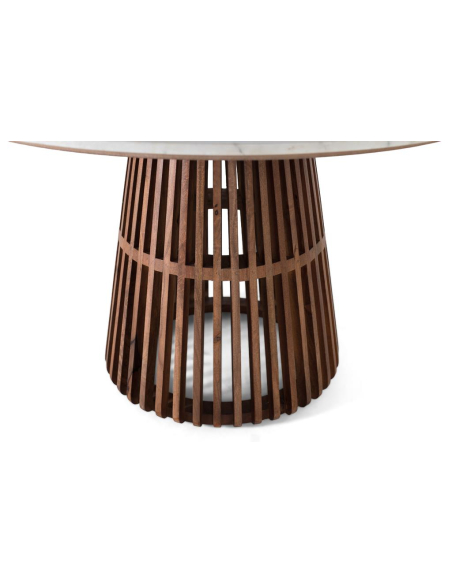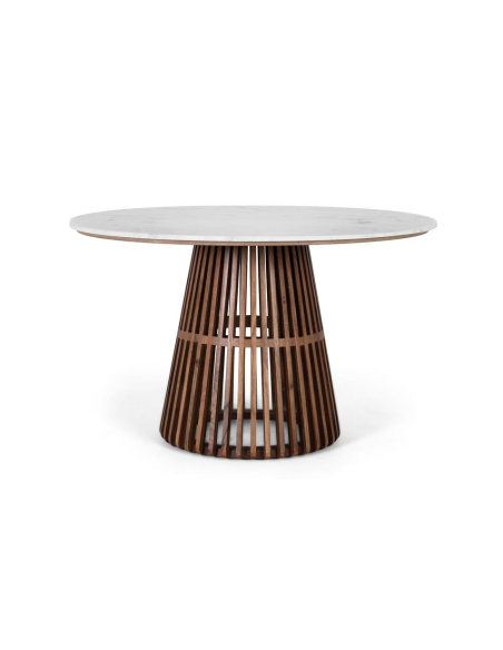Mesa de comedor redonda Motete, combina la nobleza de la madera en tono avellana con la pureza de un sobre redondo de mármol blanco. El veteado natural del mármol ilumina el espacio, mientras la base cónica de listones de madera genera un juego de luces y sombras liviano y contemporáneo. Es una mesa pensada para disfrutar de las comidas cara a cara, con la calidez de los materiales y la frescura de un diseño actual. Perfecta para comedores compactos o rincones de desayunador donde se busca presencia sin recargar. El formato circular favorece la charla, optimiza el espacio y se integra tanto con sillas tapizadas como con modelos de caño o madera. Suma un centro de mesa mínimo y deja que el material hable por sí mismo.