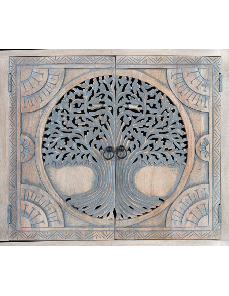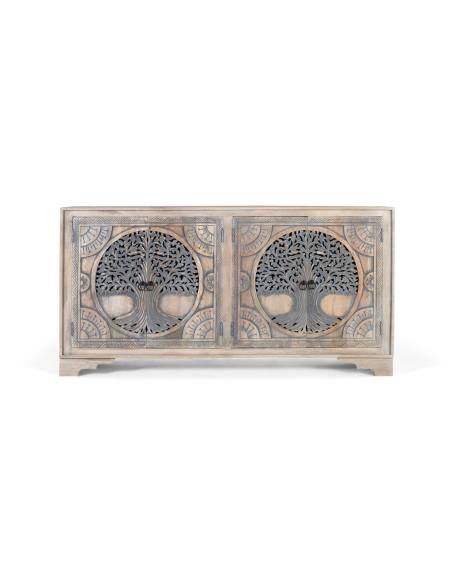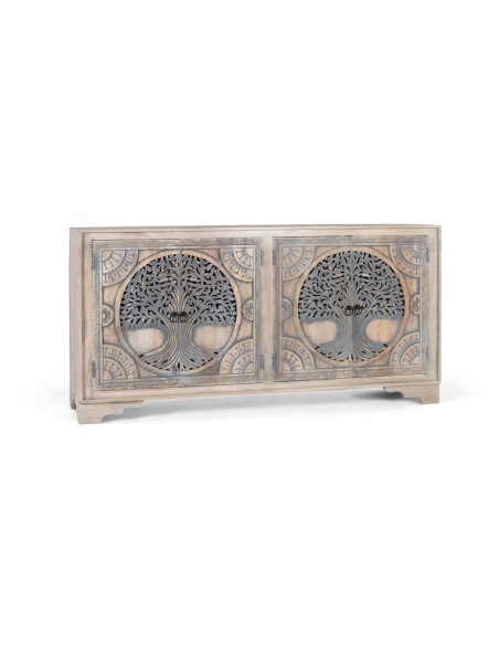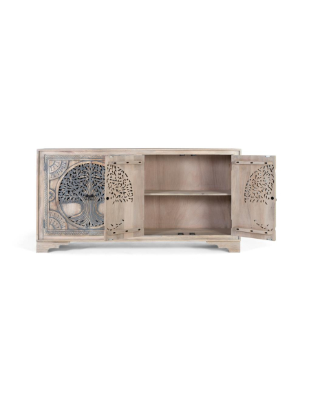 Aparador Staccato 2 puertas, con frente decorativo en relieve y detalles en azul que aportan un toque boho-mediterráneo sin perder elegancia. Sus dos puertas ocultan un interior con estantes para vajilla, mantelería o documentos, mientras la superficie superior funciona como expositor para lámparas, jarrones o cuadros. El contraste natural y azul ilumina comedores, livings y recibidores, y combina de maravilla con fibras, cerámicas y metales negros. Diseño de líneas limpias, tiradores discretos y estructura robusta para un almacenaje práctico que también decora; ideal si buscas un aparador de madera de mango con personalidad, gran capacidad y estética artesanal.