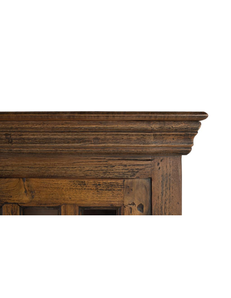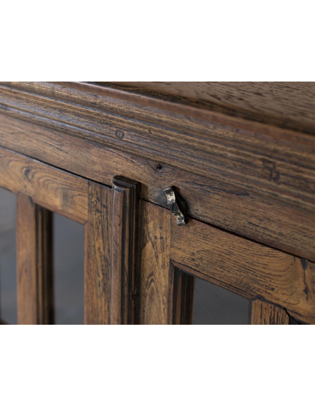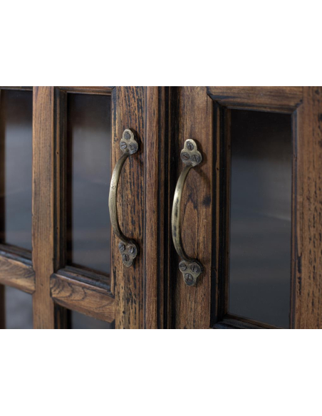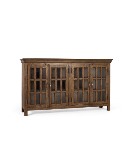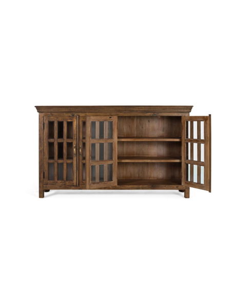 Aparador 4 puertas con vidrio, exhibe y protege a la vez. Sus cuatro puertas acristaladas con cuarterones y herrajes vistos aportan un aire vintage de bodega o antigua alacena. En el interior, estantes amplios organizan vajilla, cristalería, textiles o libros, mientras el marco robusto de teca —procedente de maderas recuperadas— garantiza durabilidad y una pátina única. Perfecto para comedor, salón o cocina amplia, también funciona como vitrina para colecciones en estudios y pasillos. El tono avellana resalta las vetas y combina con fibras naturales, hierro negro o cuero. Un mueble de gran capacidad que suma textura, historia y orden a cualquier ambiente.
