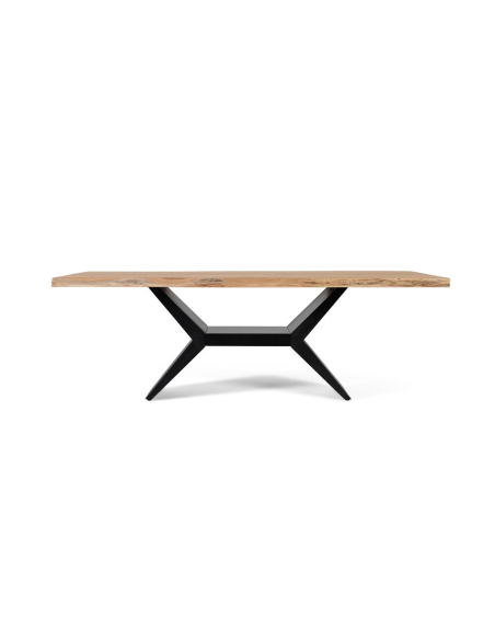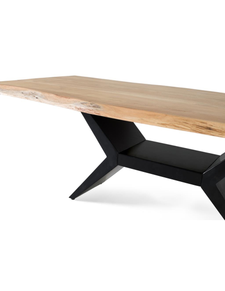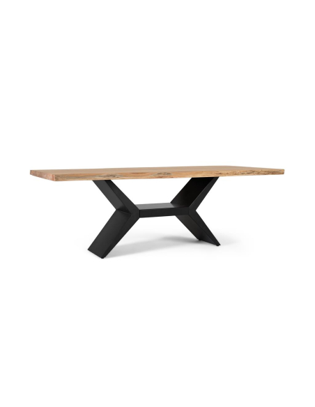 Mesa de comedor tapa rústica, luce una tapa de acacia con cantos suavemente orgánicos, nudos visibles y un tono natural que resalta el veteado. La sostiene una sólida base en hierro negro con forma geométrica en X, que aporta estabilidad y un contraste contemporáneo muy decorativo. Su amplia superficie admite reuniones familiares, comidas con amigos o jornadas de trabajo cómodas. Se integra en ambientes nórdicos cálidos, lofts urbanos e interiores rústico-modernos. Combina con sillas de madera, tapizadas o metálicas para cambiar el look según la estación. Una pieza duradera, fácil de estilizar y con mucha presencia.