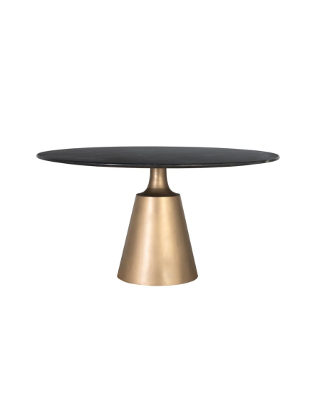 Mesa de comedor Golden, su tapa de mármol negro, de veta suave y canto fino, reposa sobre un pedestal cónico metálico en dorado cepillado que refleja la luz y aporta un brillo cálido sin estridencias. La base central libera el perímetro para que las sillas se acomoden con comodidad, favoreciendo la conversación y las sobremesas largas. Gracias a su diseño escultórico, se integra con facilidad en comedores contemporáneos, espacios art déco o ambientes eclécticos con mezcla de materiales. El contraste negro-dorado crea un punto focal inmediato, mientras que la nobleza del mármol y del metal asegura resistencia y una presencia que mejora con el tiempo. Combínala con sillas de terciopelo, piel o madera natural para un efecto sofisticado y atemporal: es la mesa que transforma el comedor en el ambiente más elegante de la casa.