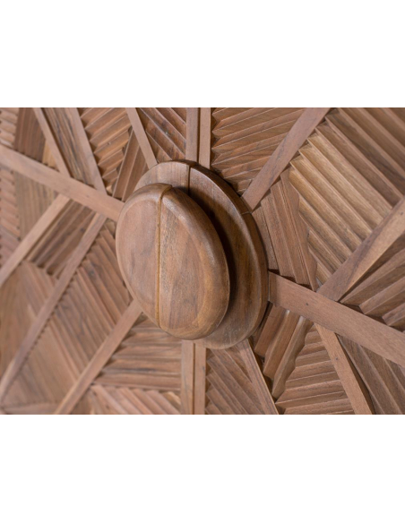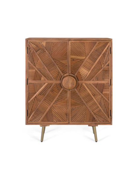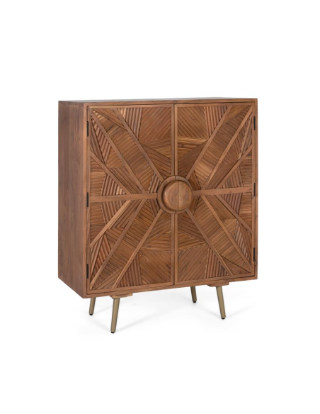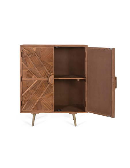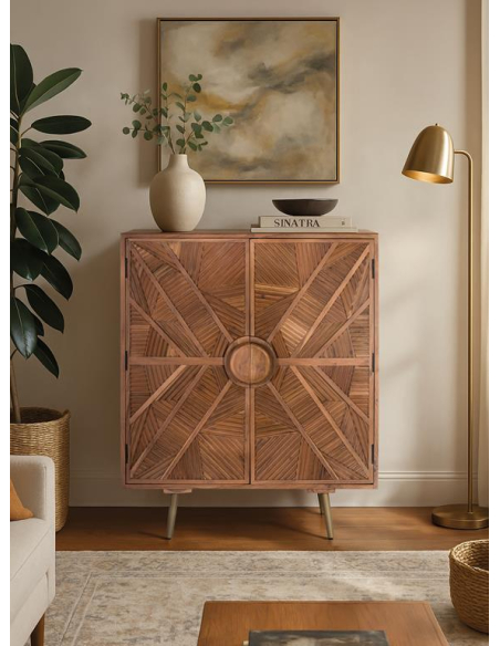 Aparador madera recortes con líneas, una pieza de carácter artesanal que destaca por su frente en relieve, formado por listones de madera cortados y dispuestos en ángulos geométricos. El tono avellana realza la veta natural del mango y aporta calidez inmediata al ambiente. Las patas cónicas en acabado latón sutil levantan el mueble del suelo y refuerzan su aire mid-century sin perder robustez. En el interior ofrece un estante que optimiza el espacio de guardado para vajilla, textiles o botellas. Es la elección perfecta para sumar almacenaje con diseño en el comedor, living o hall de entrada. Un aparador de madera maciza que combina estética contemporánea y larga vida útil, ideal para hogares que valoran piezas únicas y bien construidas.