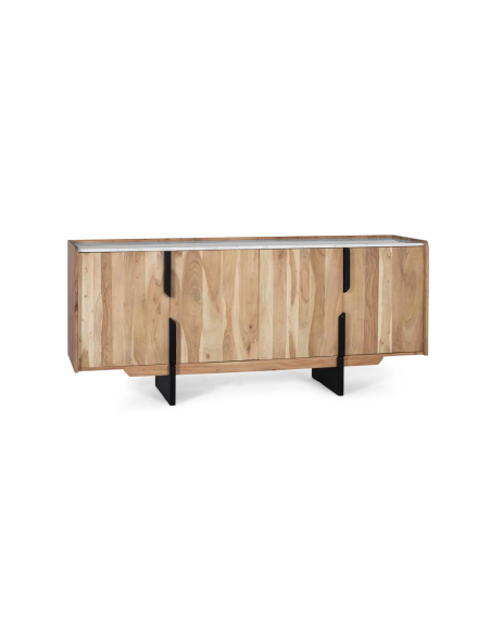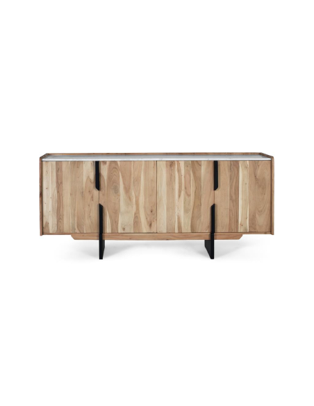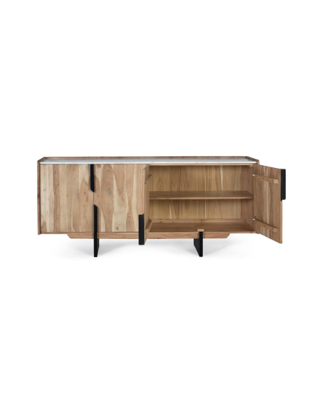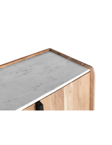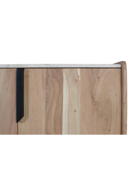 Aparador Pizzicato, diseño contemporáneo con alma natural. El frente y la estructura en madera de acacia exhiben vetas únicas que contrastan con la superficie de mármol claro, aportando luminosidad y un toque sofisticado al comedor o al living. Las líneas negras del zócalo y de los soportes enfatizan la silueta moderna y elevan el conjunto con un guiño industrial sutil. En el interior ofrece compartimentos espaciosos con estantes para guardar vajilla, mantelería o libros sin perder orden visual. Ideal para ambientes nórdicos, modernos o eclécticos que buscan materiales nobles y presencia escultórica sin recargar.