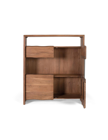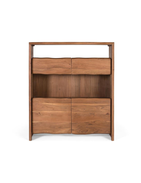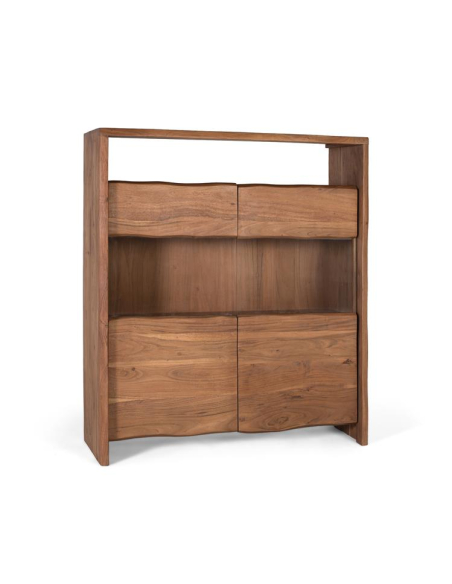 Aparador alto con curvas, este aparador alto celebra las formas orgánicas con frentes ondulados tallados en acacia maciza y cantos suavemente redondeados. El acabado natural realza la veta cambiante de la madera, aportando textura y calidez. Su formato vertical optimiza el espacio sin renunciar a la capacidad. Incluye cuatro puertas (dos superiores y dos inferiores) y un nicho abierto central para exponer piezas decorativas o tener a mano lo esencial. Es ideal como mueble bar, vitrina de textiles o almacenamiento extra en el comedor. Una pieza de autor que combina funcionalidad y diseño biofílico.